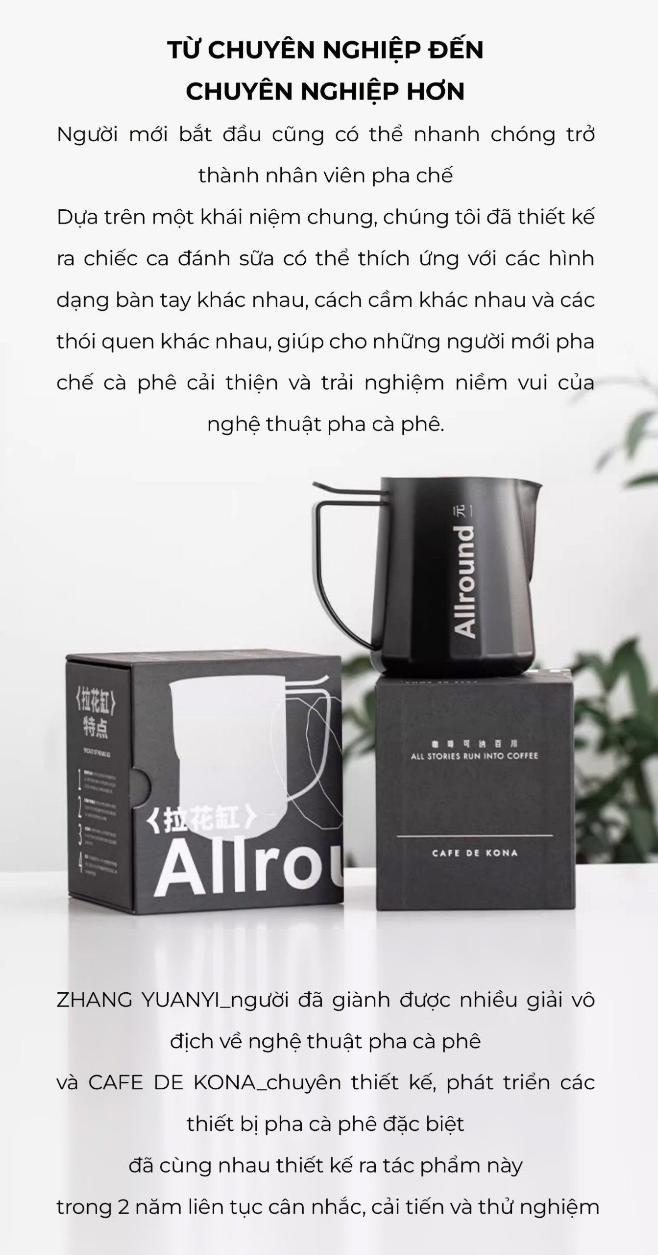 CA ĐÁNH SỮA ALL ROUND 480ml CAFEDE KONA Từ sự chuyên nghiệp lên tầm nghệ nhân Allround_Chiếc ca được các quán quân cuộc thi MBA Latte Art cùng nhau thiết kế. Với thiết kế 14