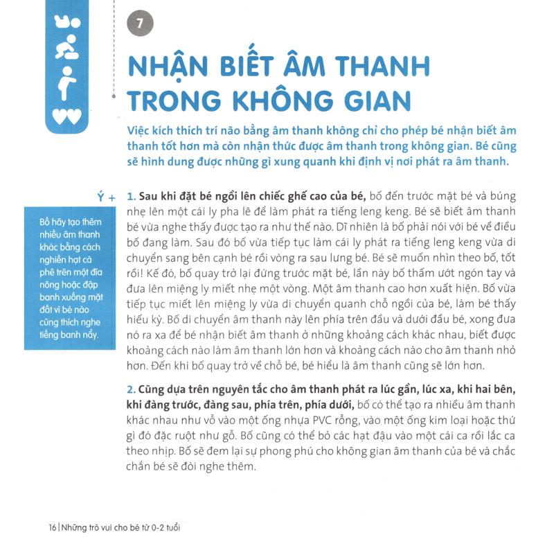 Trong tập 100 Trò Vui Cho Cha Con Chúng Mình, một chuỗi 100 trò vui cho cha hoạt động cùng con từ tuổi sơ sinh đến 5 tuổi nếu được áp dụng đúng và thường xuyên, sẽ góp phần giúp con phát triển toàn diện thể chất, tinh thần và gắn bó tình cảm cha con.