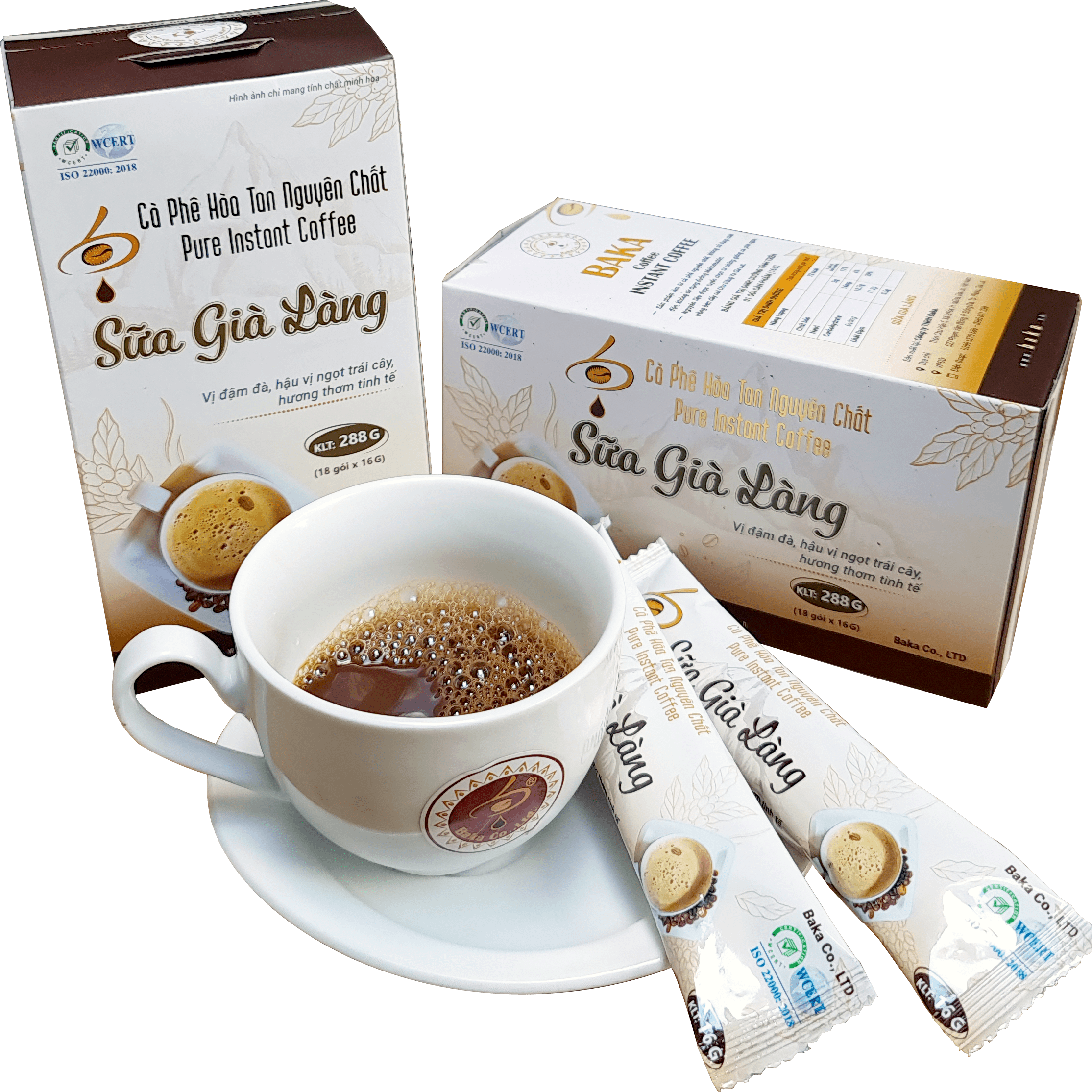 Cà Phê Hòa Tan Nguyên Chất SỮA GIÀ LÀNG - Hộp 18 gói - Sản phẩm làm từ cà phê nguyên chất, không sử dụng chất độn, không sử dụng đường Maltodextrin. - Nguyên liệu