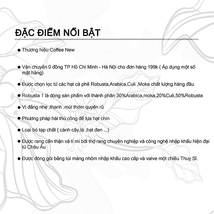 • Roast Profile.   Cà phê chất lượng phải đóng gói trong bao bì tốt nhất để ánh sáng, nhiệt độ, độ ẩm, khí CO2 không ảnh hưởng đến mùi vị cà phê.     GỞI QUÝ KHÁCH CẢM ƠN QUÝ KHÁCH ĐÃ GHÉ THĂM SHOP   Chúng ta đã biết không giống như phương Tây, người Việt Nam uống cà phê chậm. Cà phê sẽ được pha bằng phin hoặc máy và người uống sẵn lòng ngồi chờ, có thể một mình hoặc nói chuyện với bạn bè. Sau năm tới mười phút cà phê pha với đường hoặc sữa tùy khẩu vị. Chúng ta uống cà phê trong đa số trường hợp là thưởng thức, trải nghiệm và suy ngẫm chứ không đơn thuần là một loại đồ uống giải khát, uống để tạo ra kỷ niệm, hồi tưởng kỷ niệm và lưu lại kỷ niệm.   Khi thị trường cà phê đang hỗn loạn, thật giả lẫn lộn thì việc tìm kiếm nơi sản xuất cà phê uy tín, thực sự nguyên chất và thơm ngon là điều quý khách hàng quan tâm hàng đầu. Chúng tôi là một hãng cà phê đúng nghĩa và thật sự uy tín, có thể giúp bạn thoát khỏi lo lắng khi tìm mua cà phê.   Sản phẩm được chọn lựa kỹ càng, được đóng gói bằng túi PET/AL/LLDPE nhập khẩu. Chất liệu tiếp xúc cà phê bằng màng nhôm cao cấp, có khóa Zipper dễ dàng bảo quản sản phẩm, van 1 chiều Thụy Sĩ.   Sản phẩm của chúng tôi đạt tiêu chuẩn và đủ điều kiện An Toàn Thực Phẩm, được Ban Quản Lý An Toàn Thực Phẩm Cấp TP HCM chứng nhận.   TẠI SAO YÊN TÂM MUA SẢN PHẨM TẠI SHOP? Chất lượng của chúng tôi được kiểm chứng khoa học và quản lý bởi cơ quan có thẩm quyền. Được ban quản lý AN TOÀN THỰC PHẨM - TP. HỒ CHÍ MINH cấp Giấy chứng nhận.   Cách pha cà phê phin ngon ROBUSTA     ROBUSTA là sự kết hợp độc đáo với thể chất mạnh, hậu đậm, vị đắng, của cà phê Robusta và hương thơm nồng ấm, đem đến cho người thưởng thức một hương vị cà phê nguyên chất với chất lượng hoàn hảo có một không hai, mang bản sắc vốn có của cà phê Việt Nam.