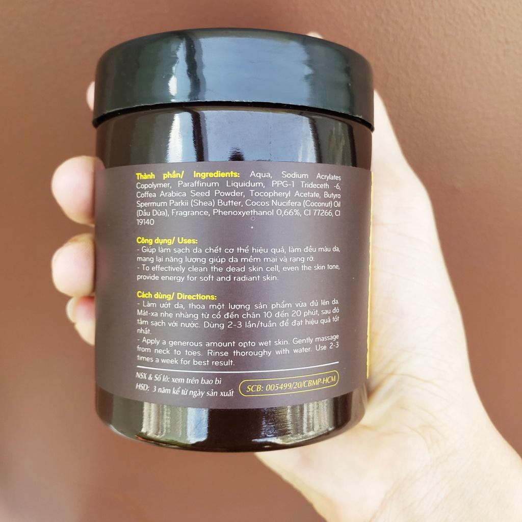 Sản phẩm được tạo từ những hạt cà phê Đăk Lăk nguyên chất xay nhuyễn, hòa quyện cùng bơ cacao Tiền Giang giúp làm sạch tế bào chết hiệu quả, làm đều màu da, mang