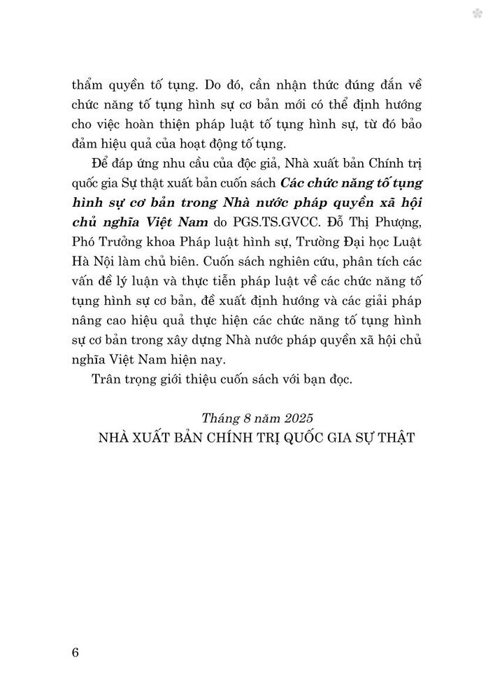 Mua tại TiktokĐể đáp ứng nhu cầu của độc giả, Nhà xuất bản Chính trị quốc gia Sự thật xuất bản cuốn sách Các chức năng tố tụng hình sự cơ bản trong Nhà nước pháp quyền xã hội chủ nghĩa Việt Nam do PGS.TS.GVCC. Đỗ Thị Phượng, Phó Trưởng khoa Pháp luật hình sự, Trường Đại học Luật Hà Nội làm chủ biên. Cuốn sách nghiên cứu, phân tích các vấn đề lý luận và thực tiễn pháp luật về các chức năng tố tụng hình sự cơ bản, đề xuất định hướng và các giải pháp nâng cao hiệu quả thực hiện các chức năng tố tụng hình sự cơ bản trong xây dựng Nhà nước pháp quyền xã hội chủ nghĩa Việt Nam hiện nay.