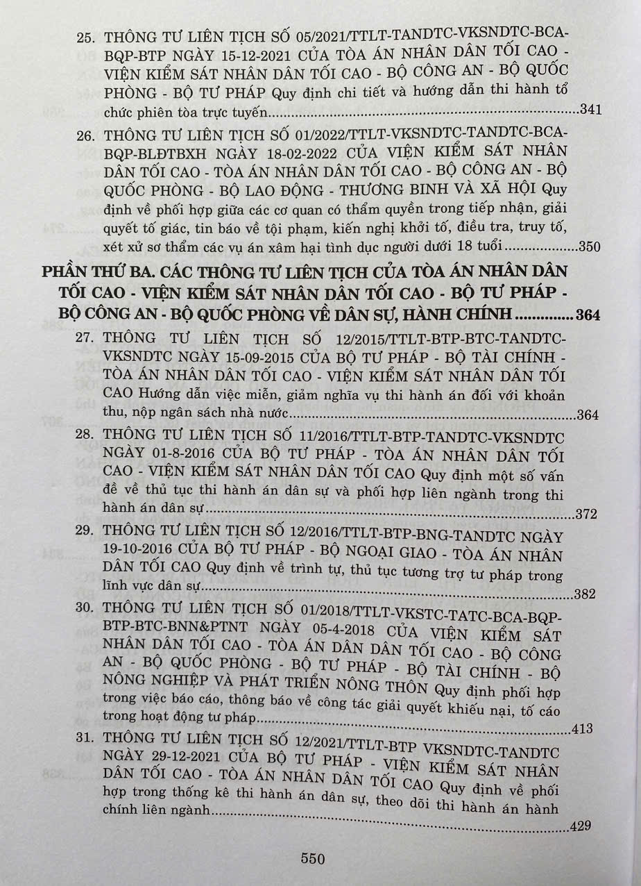 Phần III: Các Thông tư liên tịch của Tòa án nhân dân tối cao - Viện Kiểm sát nhân dân tối cao - Bộ Tư pháp - Bộ Công an - Bộ Quốc phòng về dân sự, hành chính.