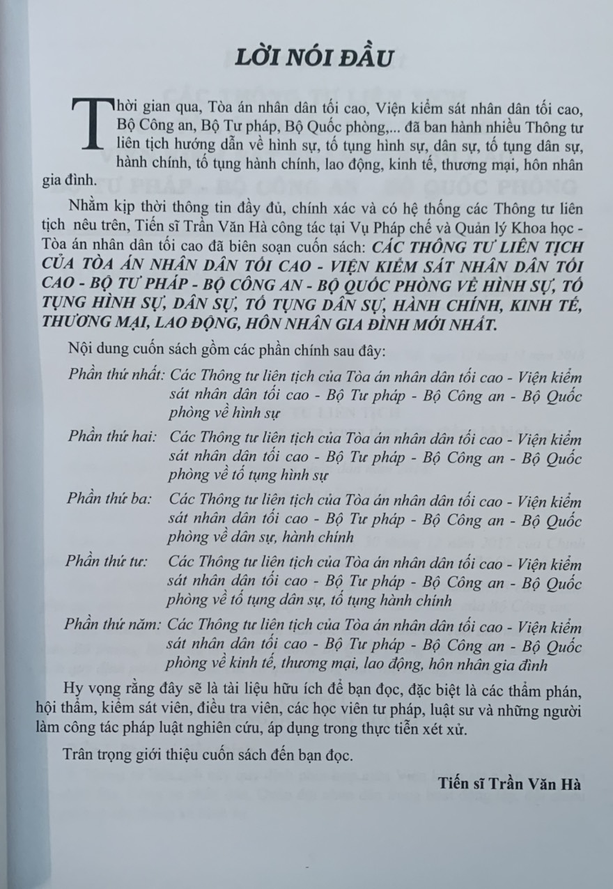 Nhằm kịp thời thông tin đầy đủ, chính xác và có hệ thống các Thông tư liên tịch nêu trên, Tiến sĩ Trần Văn Hà công tác tại Vụ Pháp chế và Quản lý Khoa học - Tòa án nhân dân tối cao đã biên soạn cuốn sách: