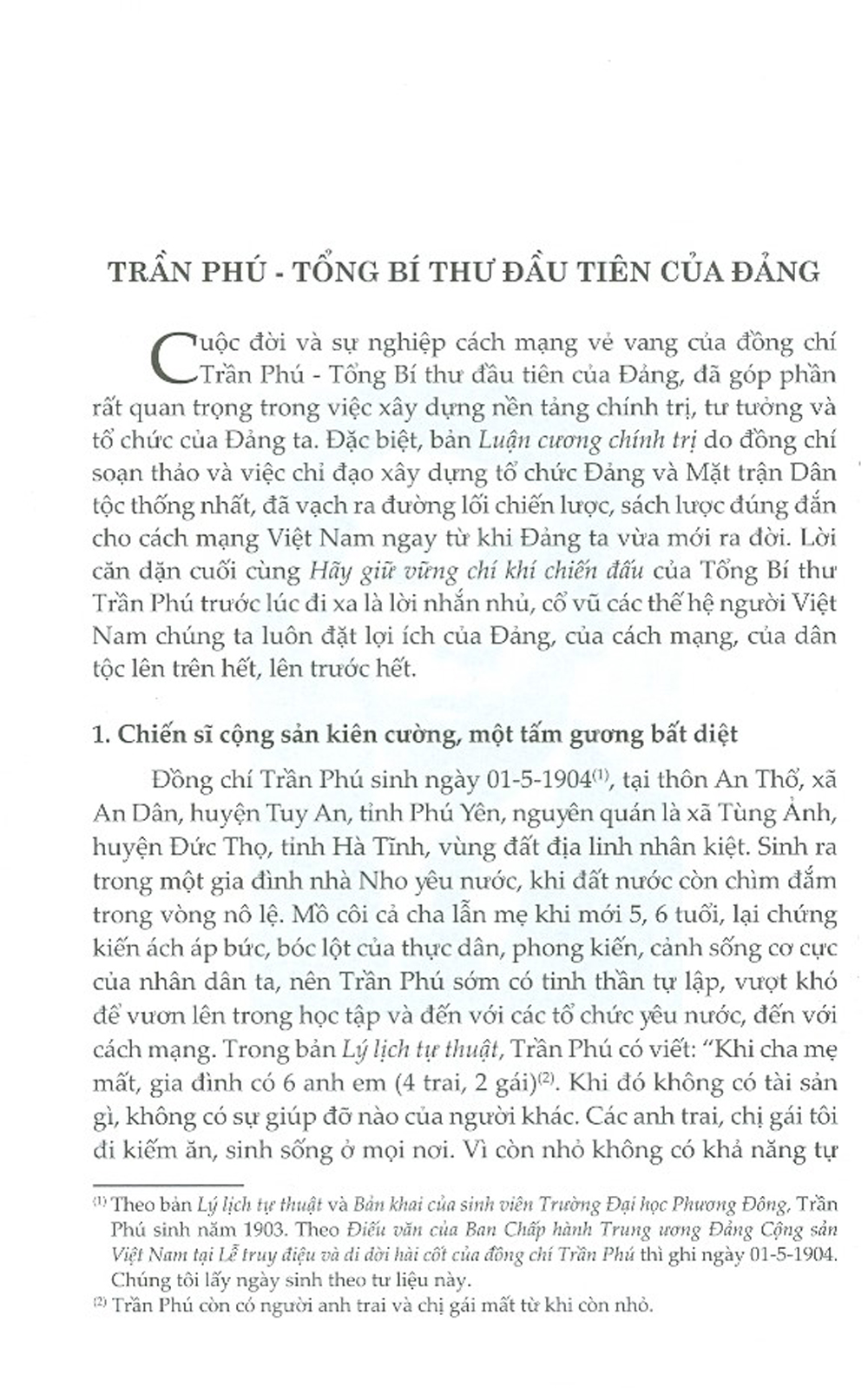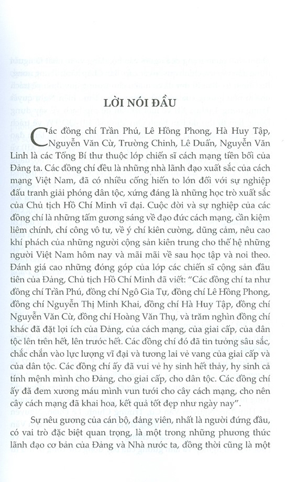 Trong giai đoạn hiện nay, để quán triệt, triển khai và tiếp tục đẩy mạnh việc đề cao trách nhiệm nêu gương của cán bộ, đảng viên, trước hết là người đứng đầu cấp ủy, chính quyền các cấp, chúng tôi biên soạn cuốn sách Các Tổng Bí thư thế hệ tiền bối của Đảng ta (1930 - 1990). Biên soạn cuốn sách, chúng tôi căn cứ vào Quyết định đợt đầu tiên của Bộ Chính trị số 50-QĐ/TW ngày 04/9/2002 về Chương trình viết tiểu sử và hồi ký các đồng chí lãnh đạo chủ chốt của Đảng và Nhà nước ta gồm mười đồng chí, trong đó có bảy đồng chí Tổng Bí thư của Đảng là các đồng chí Trần Phú, Lê Hồng Phong, Hà Huy Tập, Nguyễn Văn Cừ, Trường Chinh, Lê Duẩn, Nguyễn Văn Linh, ngoài ra còn có ba đồng chí là Tôn Đức Thắng, Phạm Văn Đồng và Phạm Hùng. Ở đây, chúng tôi tập trung nghiên cứu về cuộc đời, sự nghiệp và tấm gương của bảy đồng chí Tổng Bí thư từ năm 1930 đến năm 1990. Còn các Tổng Bí thư từ năm 1991 đến nay chúng tôi đang sưu tầm tài liệu để bổ sung cho lần xuất bản sau. Trong quá trình biên soạn, chúng tôi đã có sự kế thừa tham khảo các công trình viết về các đồng chí Tổng Bí thư của các tác giả khác.