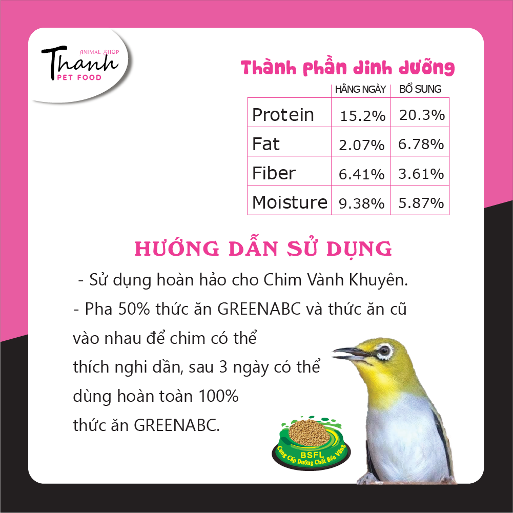 GREENABC là thức ăn cao cấp dành cho CHIM VÀNH KHUYÊN. Đặc biệt sản phẩm GREENABC được sản xuất theo phương pháp Áp dụng công nghệ PROTEIN bền vững từ bột đạm rất giàu PROTEIN – CANXI – LIPID có trong BSFL, đã được Mỹ (AAFCO) và EU chấp nhận đưa vào công thức cho ngành sản xuất thức ăn cho vật nuôi.