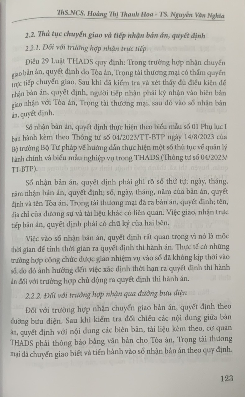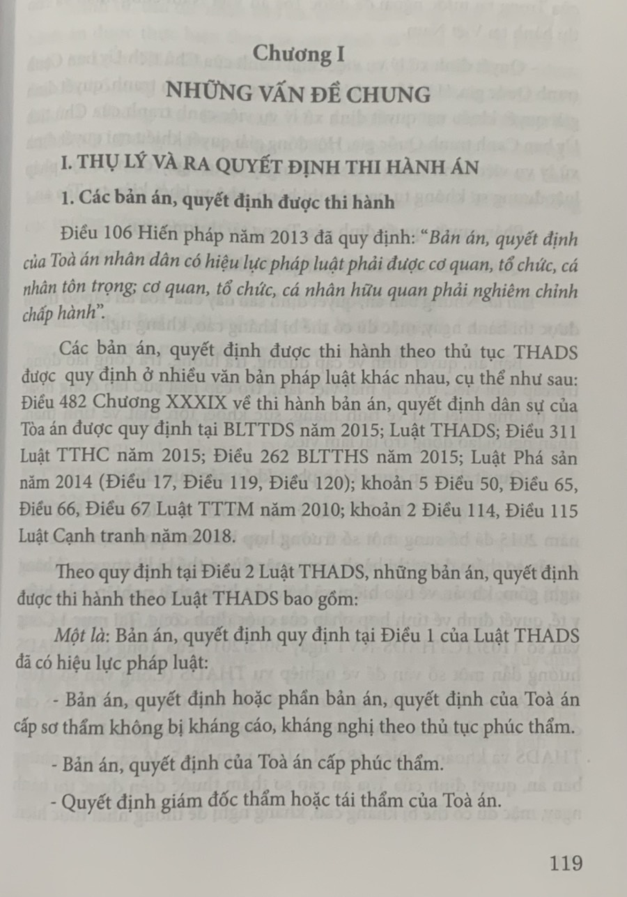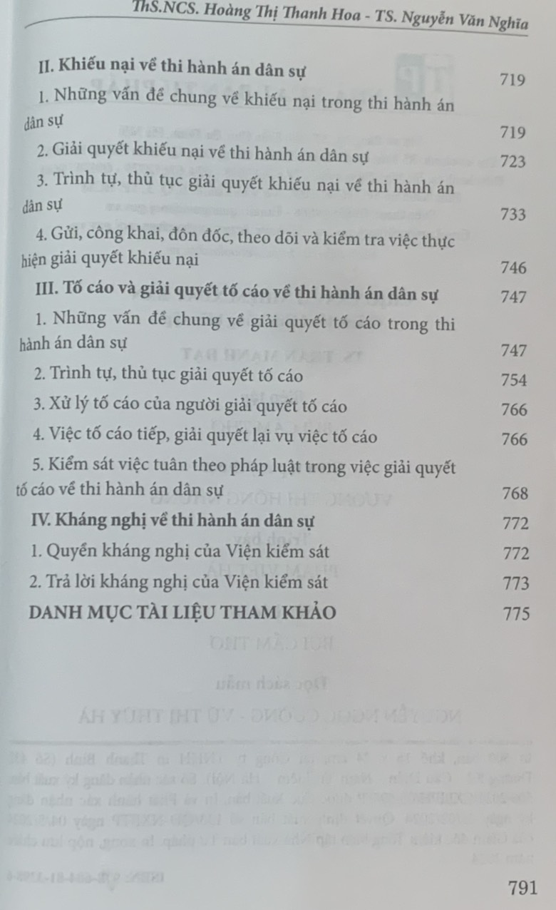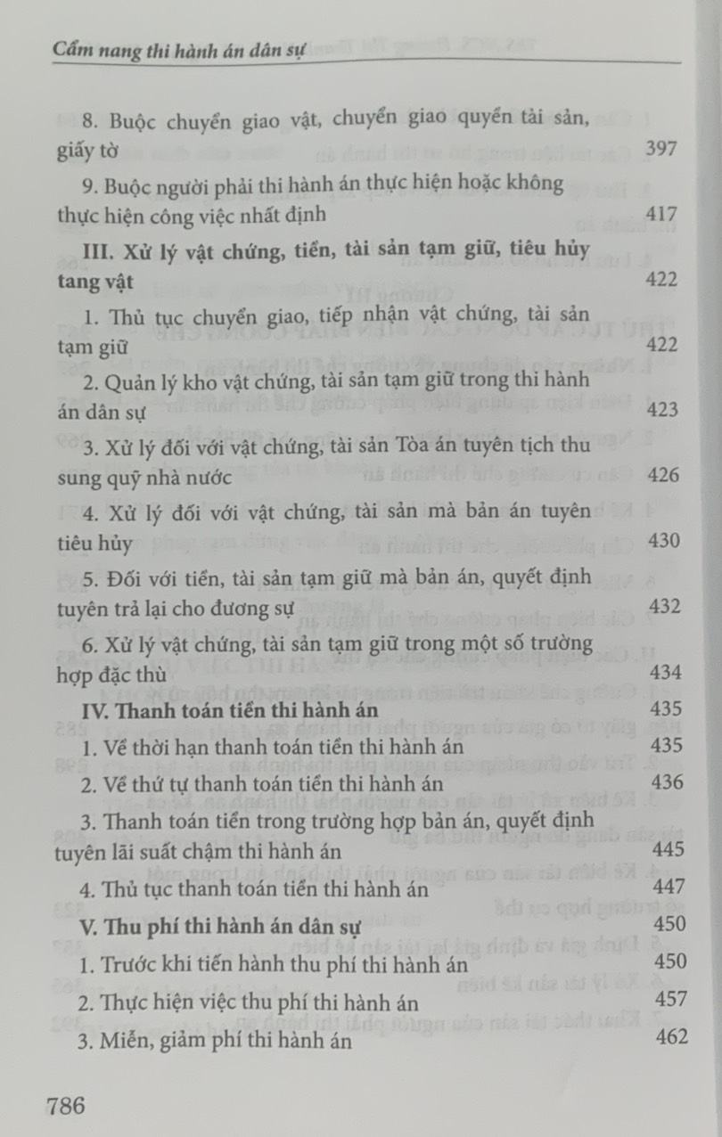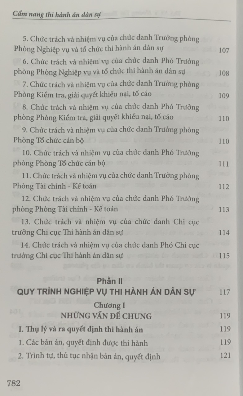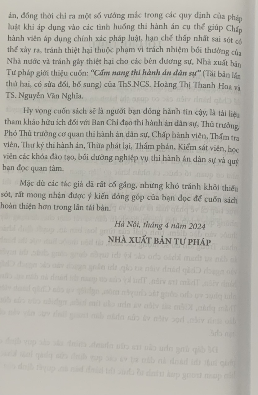 Để đáp ứng nhu cầu tra cứu nhanh, chính xác các quy định của pháp luật thi hành án dân sự và các quy định của pháp luật khác có liên quan trong quá trình tổ chức thi hành bản án, quyết định của Tòa án, đồng thời chỉ ra một số vướng mắc trong các quy định của pháp luật khi áp dụng vào các tình huống thi hành án cụ thể giúp Chấp hành viên áp dụng chính xác pháp luật, hạn chế thấp nhất sai sót có thể xảy ra, tránh thiệt hại thuộc phạm vi trách nhiệm bồi thường của Nhà nước và tránh gây thiệt hại cho các bên đương sự, Nhà xuất bản Tư pháp giới thiệu cuốn: “Cẩm nang thi hành án dân sự” (Tái bản lần thứ hai, có sửa đổi, bổ sung) của ThS.NCS. Hoàng Thị Thanh Hoa và TS. Nguyễn Văn Nghĩa.