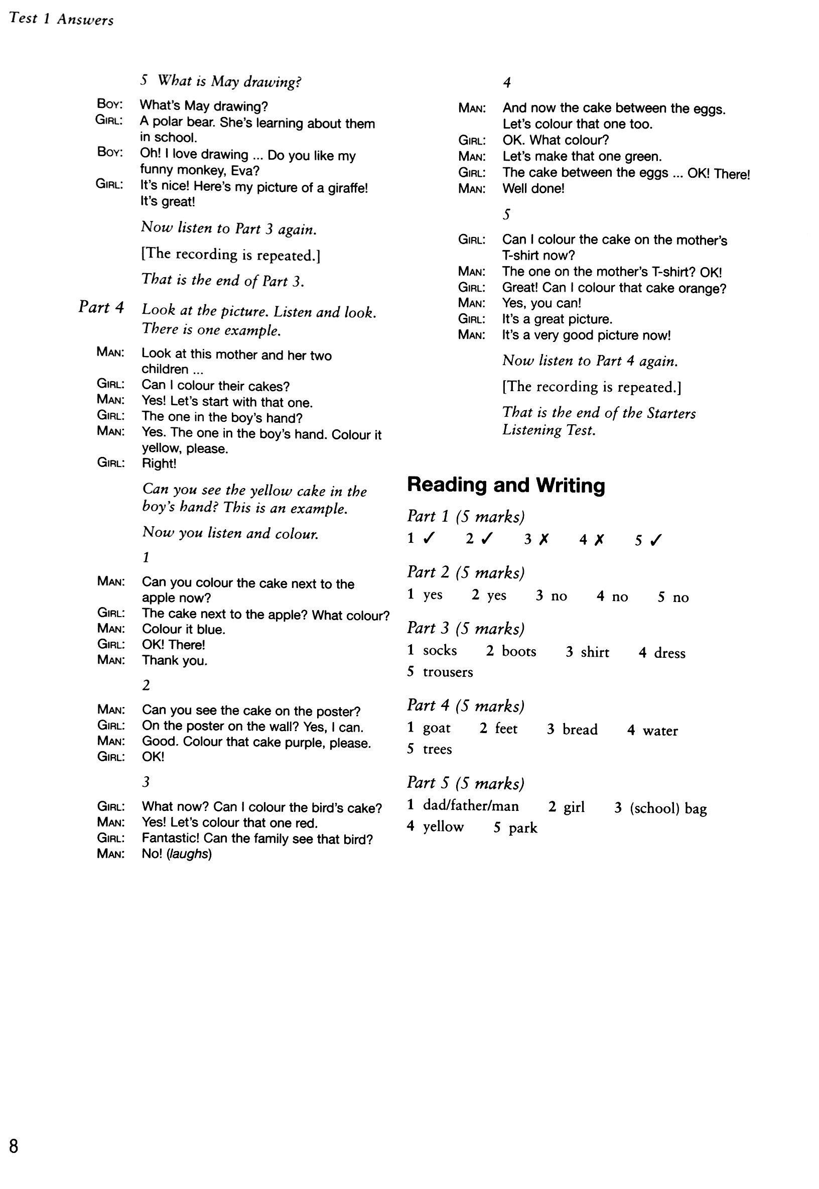 This Answer Booklet accompanies Cambridge English: Starters 2 Student's Book and Audio CD. It contains answers for all three tests, the audioscripts and examples of the type of interchange to expect in the Speaking test. It also includes the Starters Vocabulary list, organised by theme. An Audio CD (which contains the listening sections of the tests) and the Student's Book are available separately.
