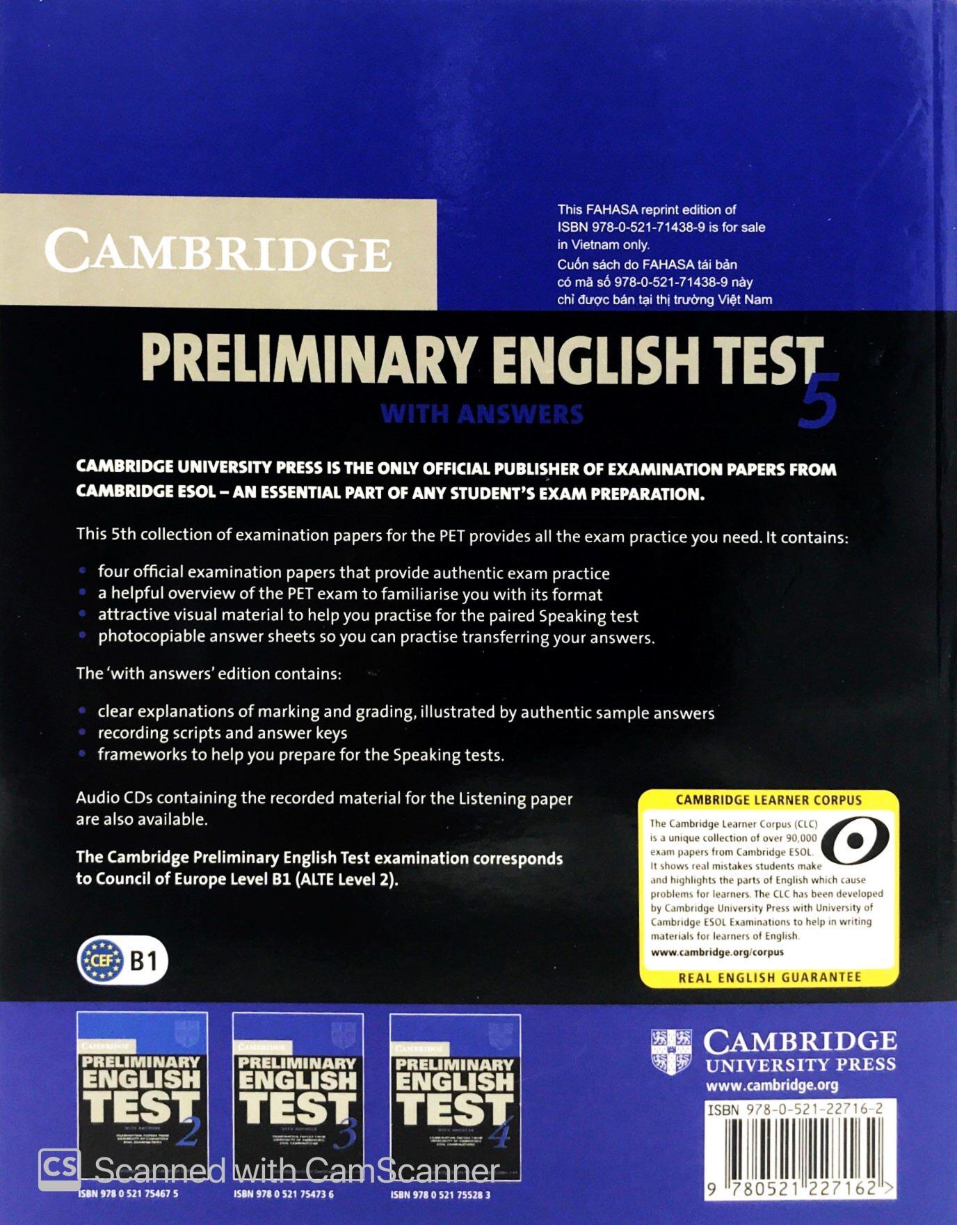 The Cambridge Preliminary English Test 5 practice tests provide candidates with an excellent opportunity to familiarise themselves with the 2004 PET exam and to practise examination techniques. The Student's Book contains practice material for Paper