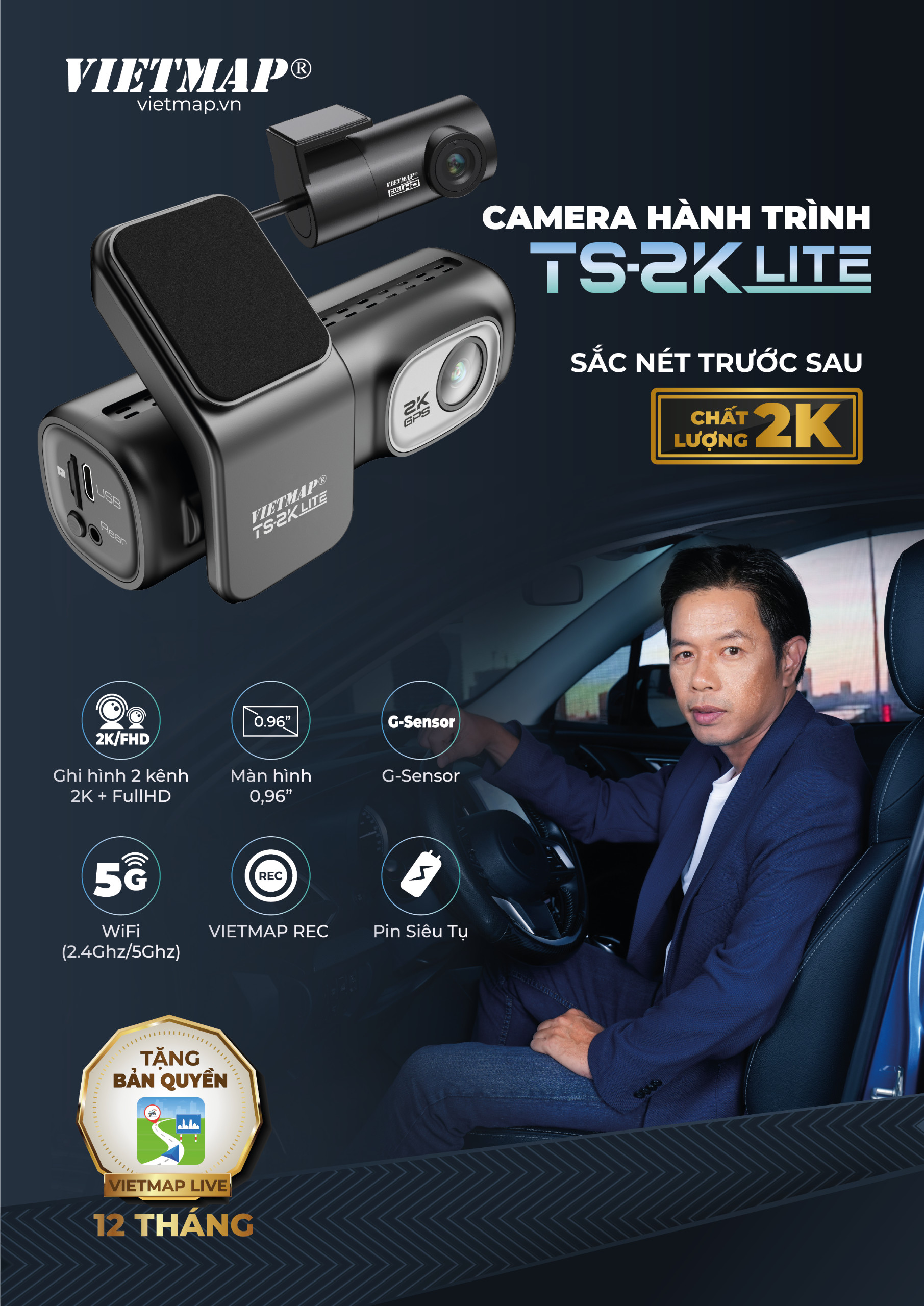 - Model: TS-2K Lite - Ghi hình 2 kênh trước sau, trước 2K, sau Full HD - Là dòng camera thuần ghi hình, không có cảnh báo giao thông bằng giọng nói Camera VIETMAP TS-2K