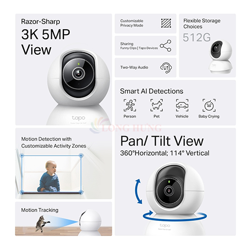 Độ phân giải 3K QHD – Hình ảnh rõ nét, chi tiết gấp 1.5 lần Full HDGóc xoay linh hoạt – Xoay ngang 340°, dọc 70° cho tầm nhìn toàn diệnAI nhận diện thông minh – Phân biệt người, vật nuôi, phương ti...