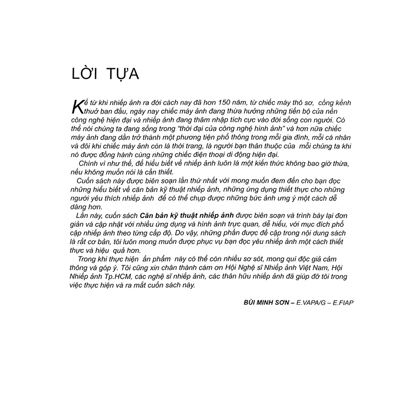 “Ít có bộ môn sáng tác nghệ thuật nào thường xuyên gắn bó với chu kỳ sống của chúng ta như nhiếp ảnh”. Đúng như nhận định đầu tiên trong Lời giới thiệu sách, từ xưa cho đến nay, ngay từ khi ra đời (cách đây trên 150 năm), chiếc máy ảnh đã đóng một vai trò quan trọng trong việc lưu giữ, chụp lại những hình ảnh, những khoảnh khắc, từng chặng sống trong cuộc đời mỗi chúng ta, những khoảnh khắc nhờ chiếc máy ảnh chụp lại mà các thế hệ sau có thể chiêm ngưỡng những hình ảnh, tư liệu lịch sử quý giá hay những kỷ niệm dù nhỏ nhất.
