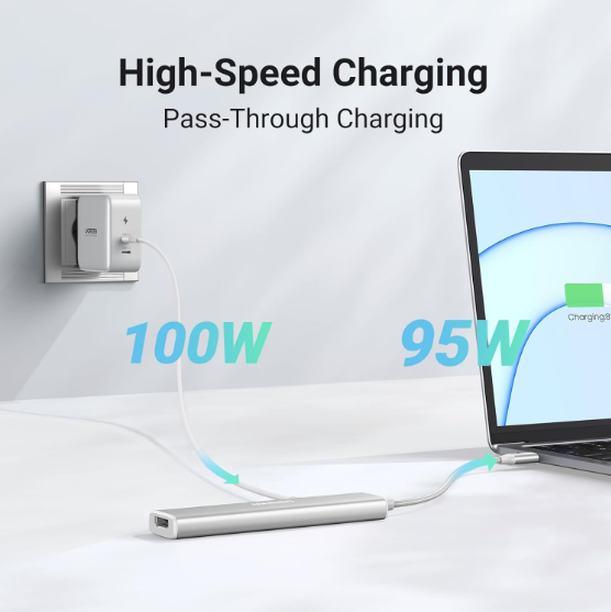 - Sạc 100W: USB-C Hub 5 trong 1 Ugreen 35580 hỗ trợ sạc qua USB C lên đến 95W qua cổng Type-C để duy trì nguồn điện cho máy tính xách tay của bạn. 5W được dành riêng cho các hoạt động giao diện khác. Bộ sạc và cáp sạc không được bao gồm. Khi trình diễn screencast hoặc truyền tệp, vui lòng không cắm hoặc rút bộ sạc PD để tránh mất hình ảnh hoặc dữ liệu.