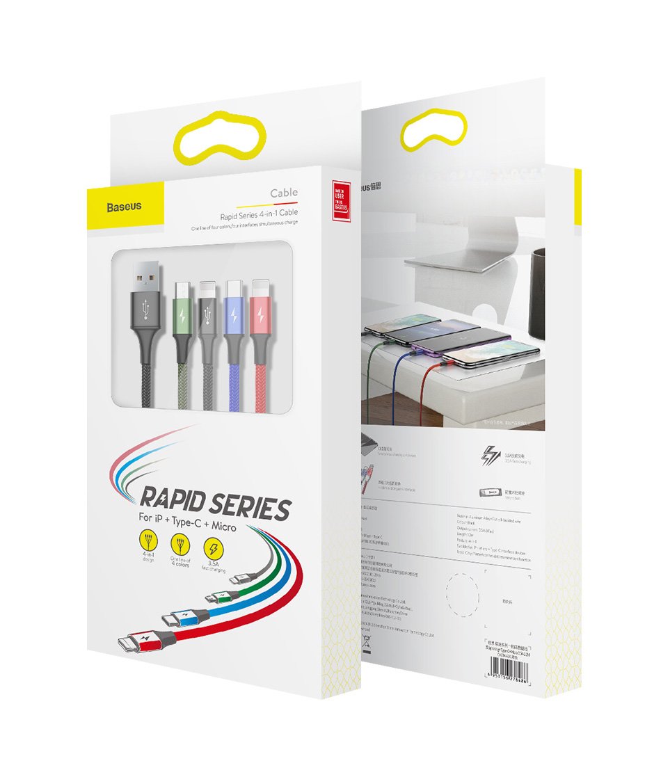- Cáp sạc đa năng 4 trong 1 cho điện thoại/ I-pad CA1T4 3.5A Baseus Rapid Series 4 in 1 cable (3.5A, 1.2M, for I-phone, Type-C, Micro, Fast charge 4 in 1 Cable) là phiên bản nâng cấp của cáp sạc 3 đầu Baseus Rapid series 3 in 1 đang rất được người dùng ưa chuộng. Sản phẩm được bổ sung thêm 1 đầu kết nối cho phép bạn có thể kết nối với 4 thiết bị  cùng lúc cỉ với 1 sợi cáp duy nhất.