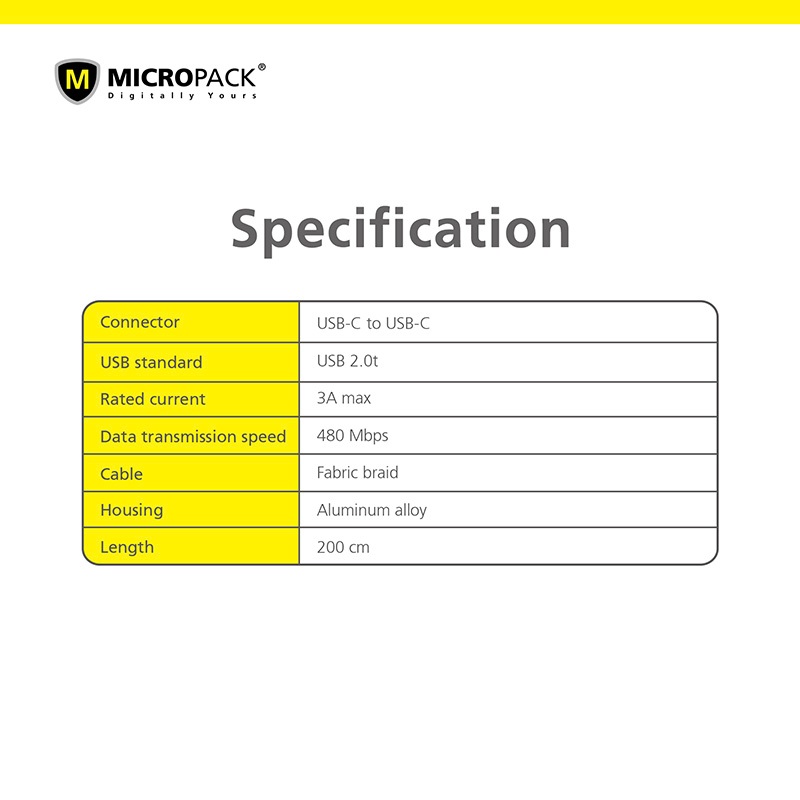 • Chuẩn USB: USB2.0 • Đầu nối: USB-C sang USB-C • Tốc độ truyền dữ liệu: 480Mbps • Dòng điện định mức: tối đa 3A • Cáp: Silicon mềm • Vỏ: Vỏ TPE có mạ
