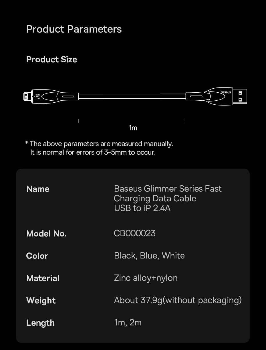 - Baseus Glimmer Series là dòng cáp sạc vải dù siêu bền nổi tiếng của Baseus. Sản phẩm sở hữu thiết kế trẻ trung, chất liệu cao cấp, màu sắc trẻ trung hiện đại. Ngoài