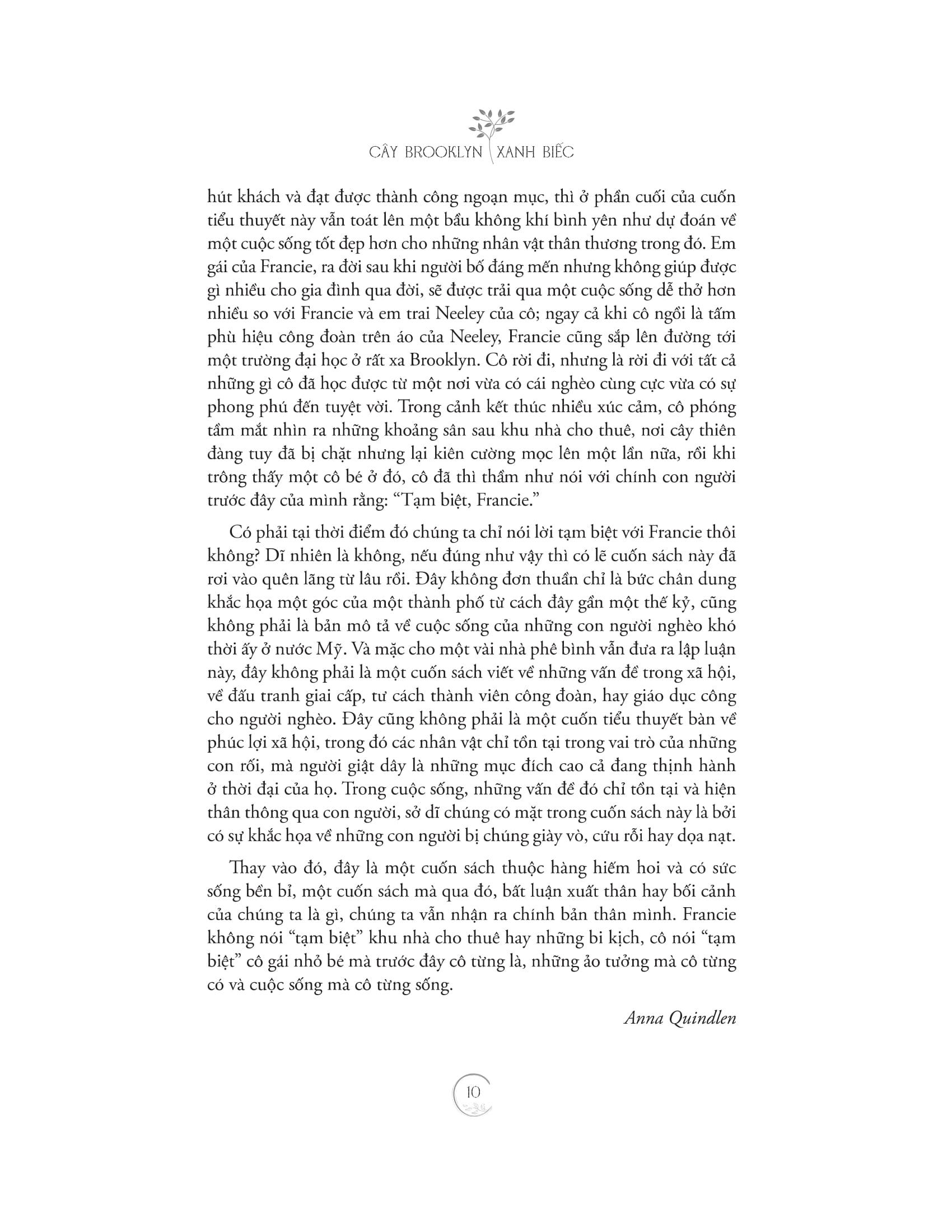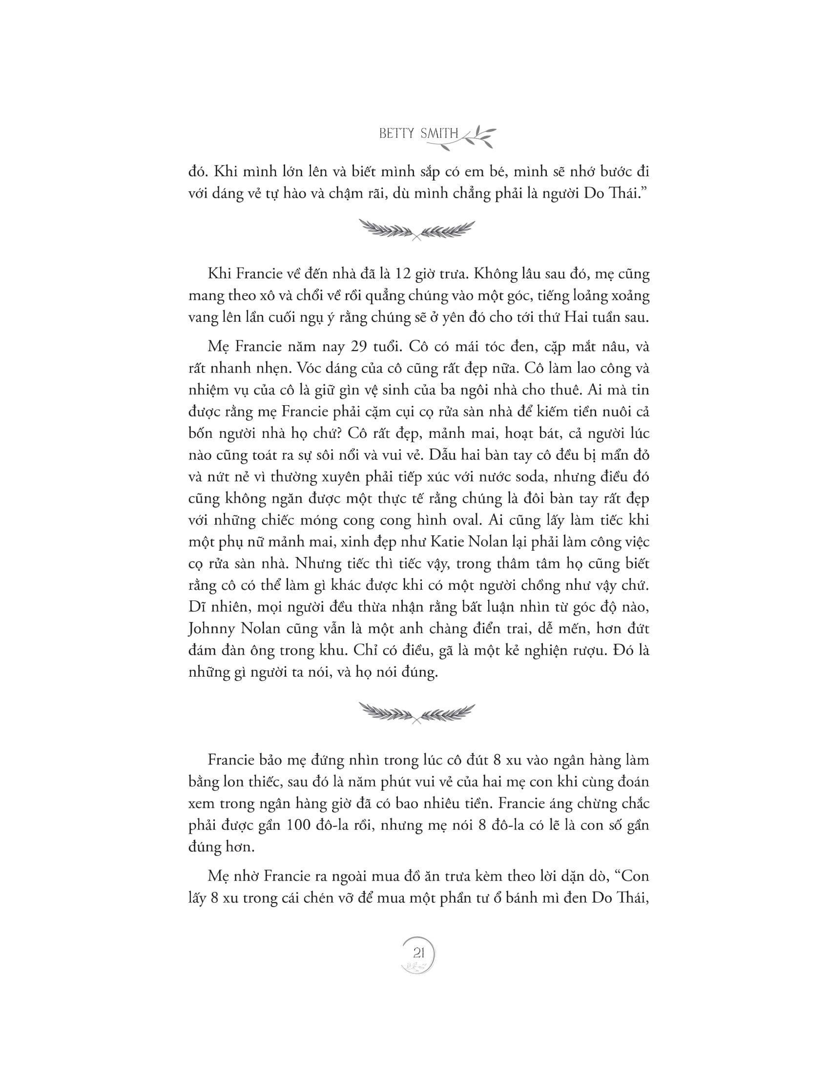 Ngay từ khi chập chững bước chân đến thế giới, Francie Nolan đã được định sẵn sẽ phải trở thành một thiếu nữ cứng rắn, bởi vì lớn lên trong khu ổ chuột Williamsburg ở Brooklyn, New York đòi hỏi con người ta phải luôn dũng cảm, khôn ngoan và mạnh mẽ. Thường bị hàng xóm khinh miệt vì những hành vi thất thường và lập dị của gia đình mình – chẳng hạn như bố cô, Johnny thích rượu và dì Sissy liên tục kết hôn nối tiếp nhau mà không ly hôn với chồng trước – không ai, kể cả là Francie, có thể nói rằng cuộc sống của gia đình Nolan thiếu kịch tính. Với những bước ngoặt choáng ngợp, đau lòng nhưng cũng đầy thăng hoa, những trải nghiệm hằng ngày của gia đình Nolan hiện lên chân thật, nguyên bản và là mối dây dịu dàng buộc những thành viên trong gia đình lại với nhau.