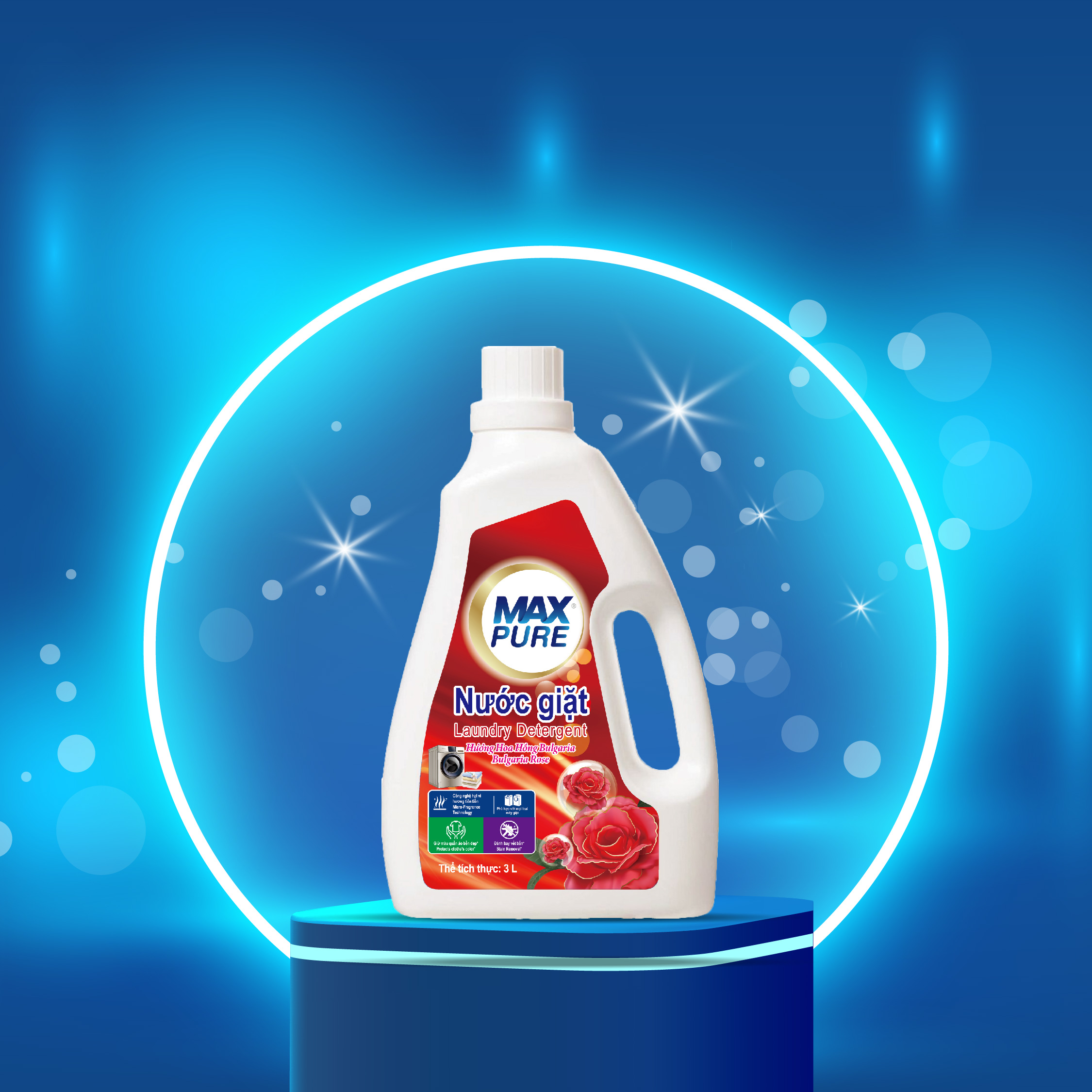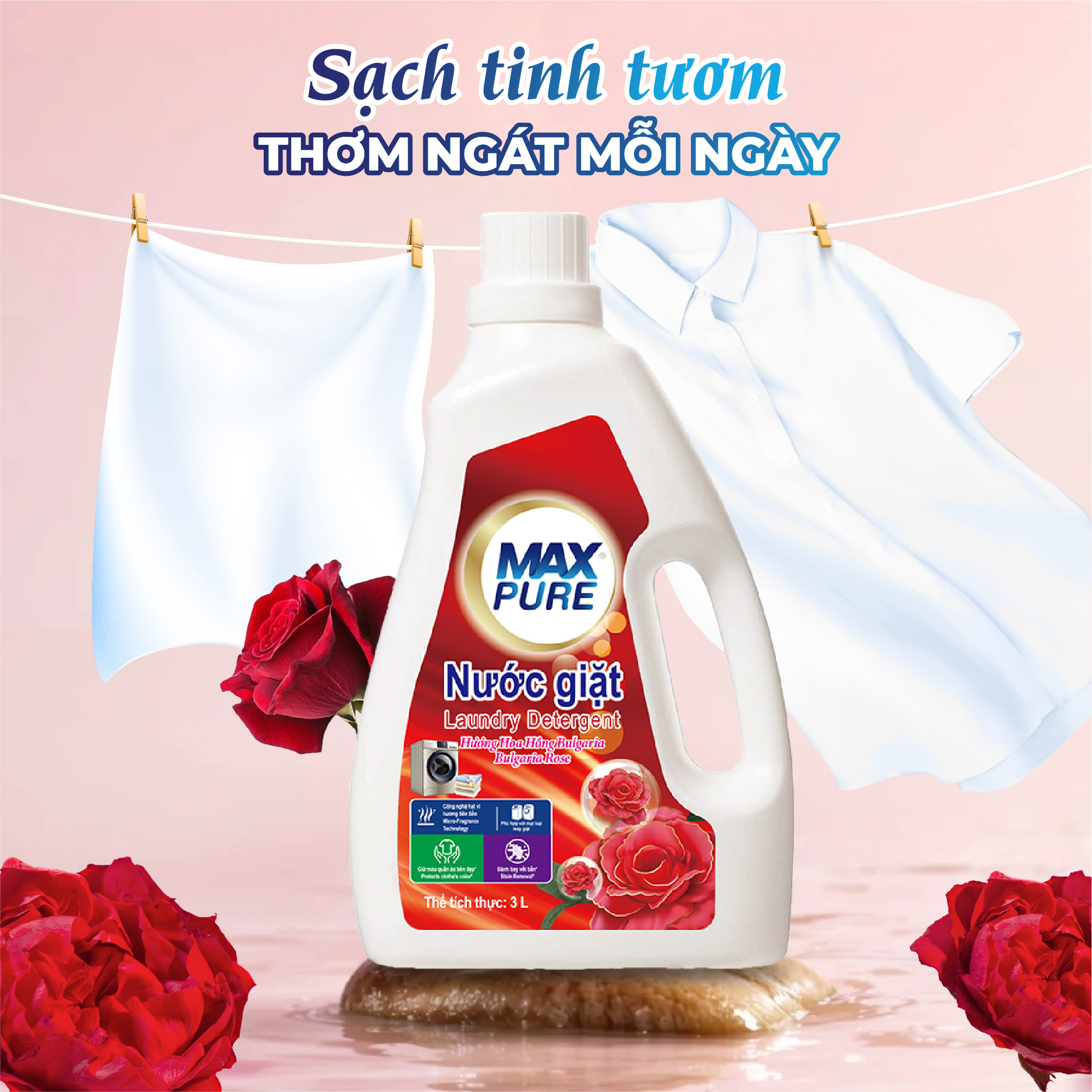 ✨Chai nước giặt Maxpure Hương Hoa Hồng Bulgaria 3L - TẶNG 1 dây 10 gói nước xả hương CoCo