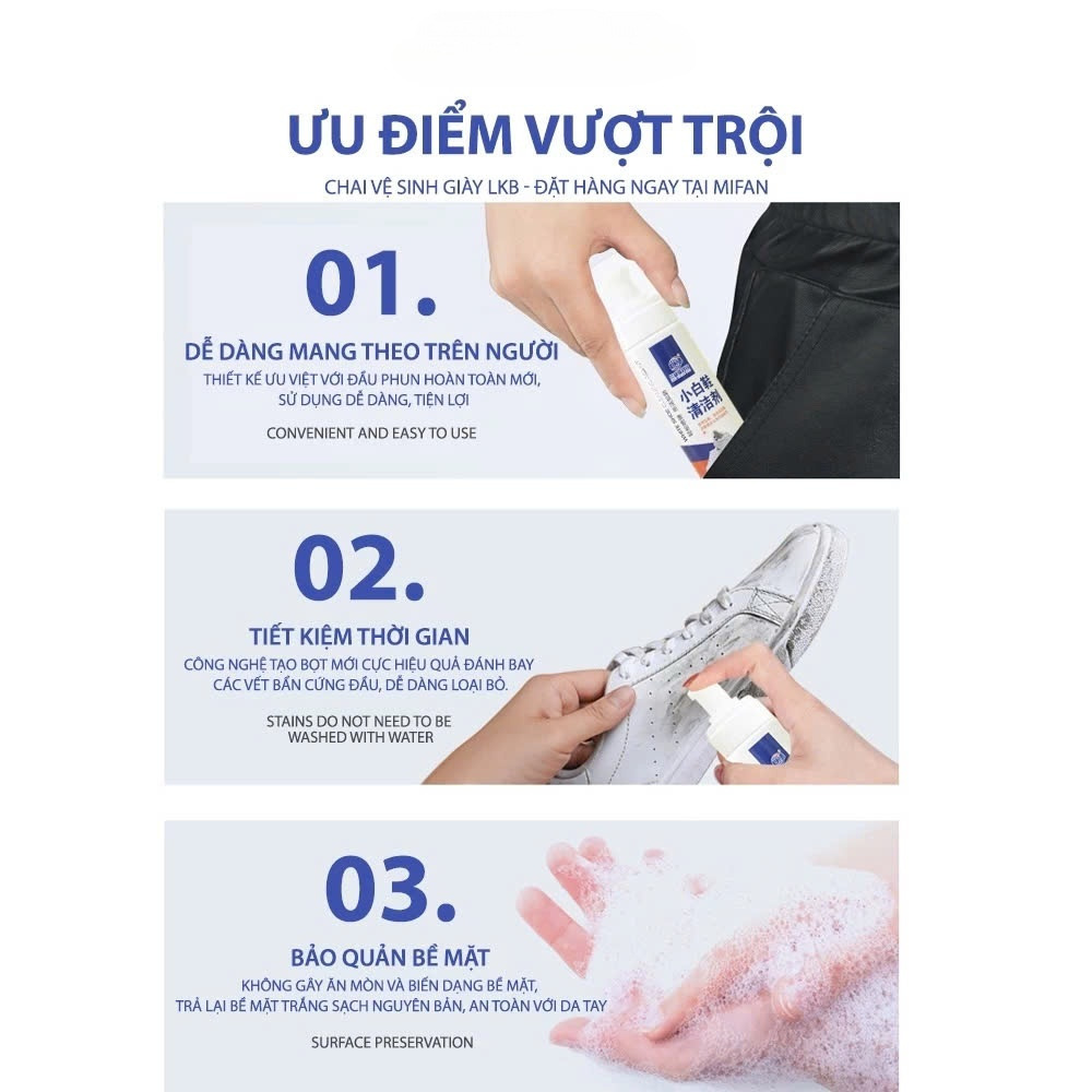 ------------ TÍNH NĂNG NỔI BẬT ------------- CÔNG NGHỆ KHỬ KHUẨN 2 TRONG 1: Làm sạch nhanh và tiêu diệt vi khuẩn, giúp bề mặt giày, dép trở nên trắng sáng trở lại. BỌT SIÊU MỊN, KHÔNG CÓ CẶN: Không vón cục hay để lại cặn như các dòng vệ sinh truyền thống. ĐẦU XỊT TIỆN LỢI: Thiết kế nâng cấp với đầu phun thế hệ mới, cho lượng bọt đều và dễ dàng hơn. BẢO QUẢN BỀ MẶT: Công thức an toàn, không gây ăn mòn hay biến dạng bề mặt. TIẾT KIỆM THỜI GIAN: Không cần giặt, sạch ngay chỉ sau 30s