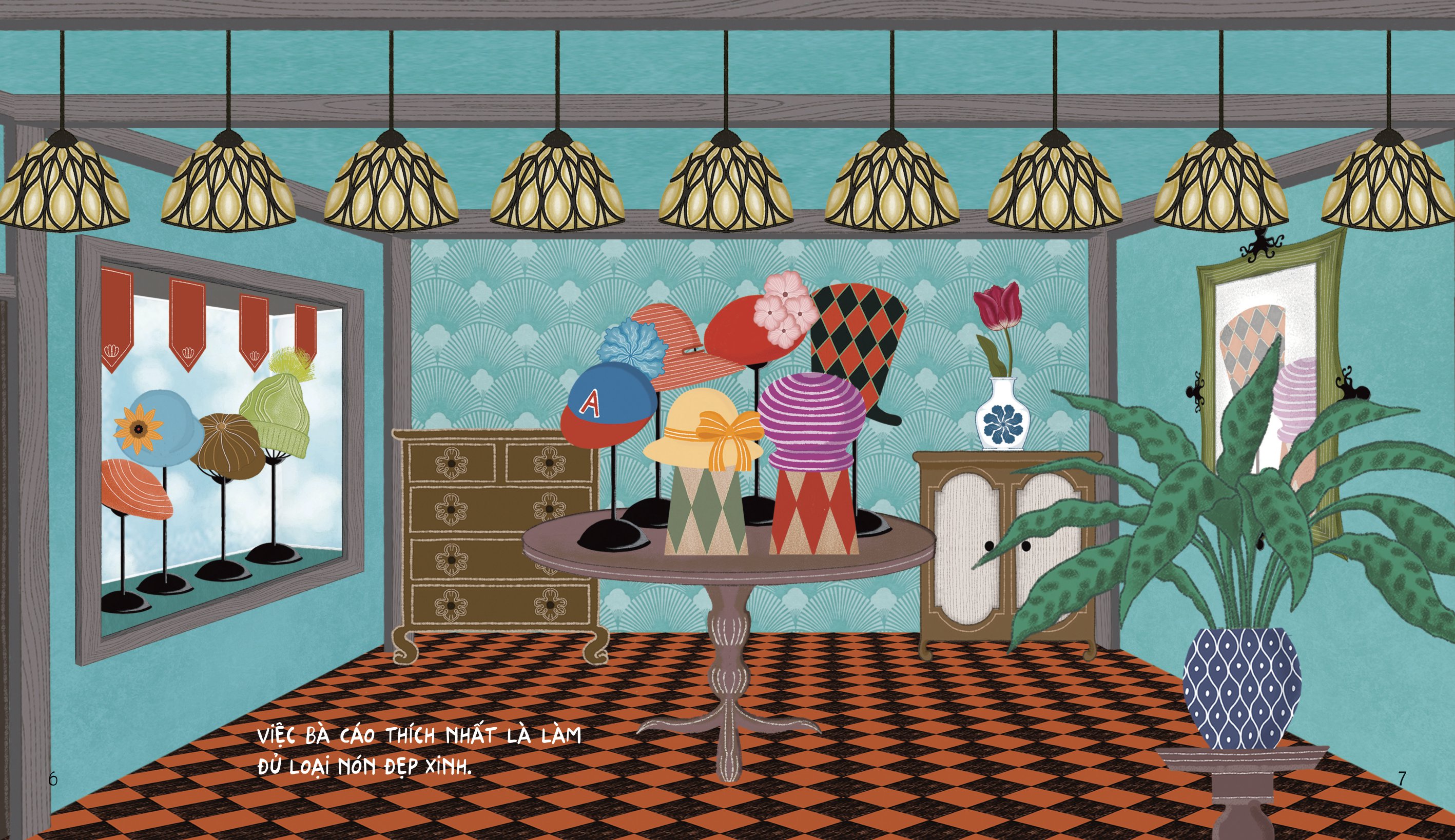 Mỗi ngày Bà Cáo đều say mê làm nón. Cửa tiệm của Bà Cáo có đủ kiểu nón đẹp nhất trên đời: Nón bê rê, nón chóp cao, nón lưỡi trai… Mỗi vị khách lại yêu thích một loại nón riêng. Mời bạn đến thăm cửa tiệm tuyệt vời của Bà Cáo nhé!