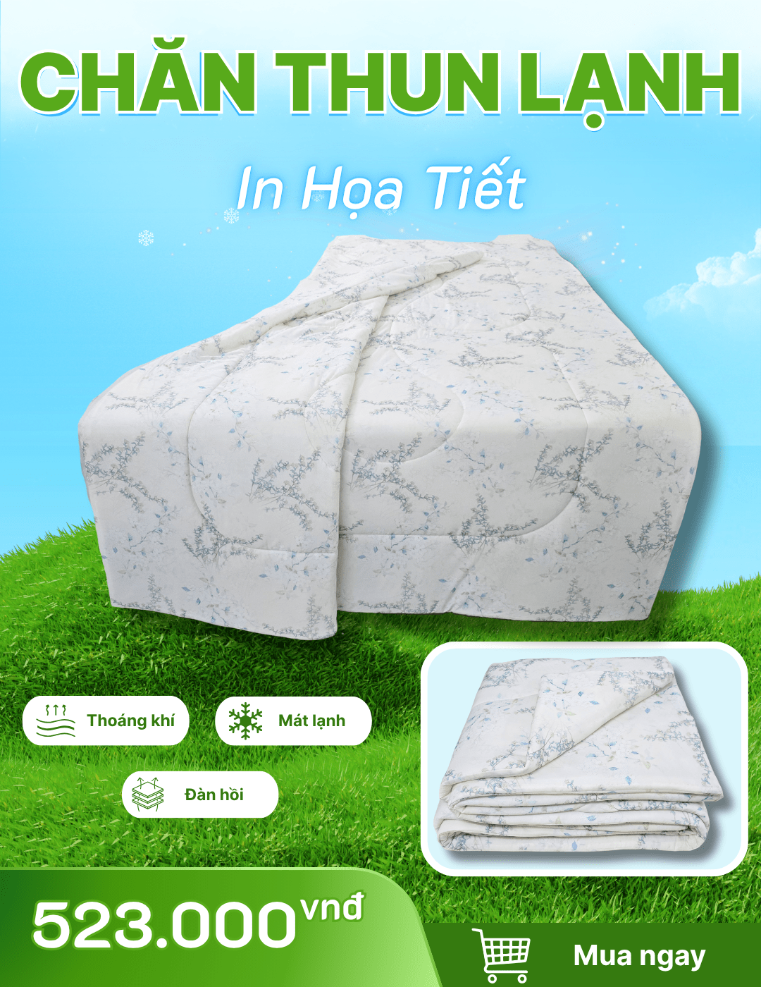 Thông Tin Sản Phẩm: Tên sản phẩm: Chăn chần Thun Lạnh in Họa Tiết Chất liệu vải: 95% Polyester & 5% Spandex Bao bì: Túi PVC quai xách Kích thước sản phẩm: 180cm x 200cm