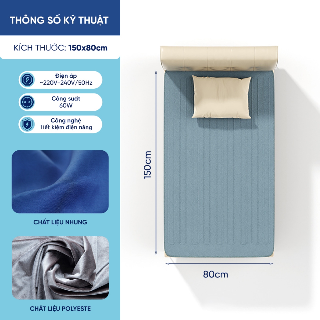• Cân nặng: 0.95 – 1.15kg.   Bảo vệ sức khỏe Thiết bị không chỉ giữ ấm cơ thể mà còn có hỗ trợ lưu thông máu huyết và trao đổi chất. Chăn đệm điện tạo cảm giác dễ chịu và thoải mái vì không bị mất oxy về đêm. Khi sử dụng, bạn hãy lấy thêm ga hay chăn mỏng trải lên trên và chọn nhiệt độ thích hợp để mang đến hiệu quả cao.   Chất liệu cao cấp, giữ nhiệt Chất liệu của Chăn đệm điện Polyeste REB-60SG và nhung REB-60SB giữ ấm cực tốt, bề mặt mềm mịn. Màu xám trang nhã dễ sử dụng.   Bộ điều chỉnh linh hoạt  Chăn đệm điện trang bị bộ điều chỉnh nhiệt linh hoạt giúp người dùng có thể tùy chỉnh và điều khiển mức nhiệt mình mong muốn. Các nút bấm trên bộ điều khiển nhạy bén, linh hoạt giúp người dùng sử dụng tiện lợi và đơn giản. Chăn điện Rapido có các mức nhiệt như sau: Mức 0: Tắt Mức 1: Nhiệt thấp Mức 2: Nhiệt trung bình Mức 3: Nhiệt cao   Dễ dàng vệ sinh và bảo quản Trước khi vệ sinh, ngắt kết nối sản phẩm khỏi nguồn điện, chờ nguội. Sử dụng vải mềm, ẩm để làm sạch các vết bẩn nhỏ. Giặt tay nhẹ nhàng, có thể sử dụng máy giặt nhưng phải để chế độ giặt nhẹ, êm, chậm (chế độ giặt đồ len).   Chế độ bảo hành Bảo hành 12 tháng về điện lỗi do nhà sản xuất, nệm lỗi 1 đổi 1 trong vòng 7 ngày.    Lưu ý: