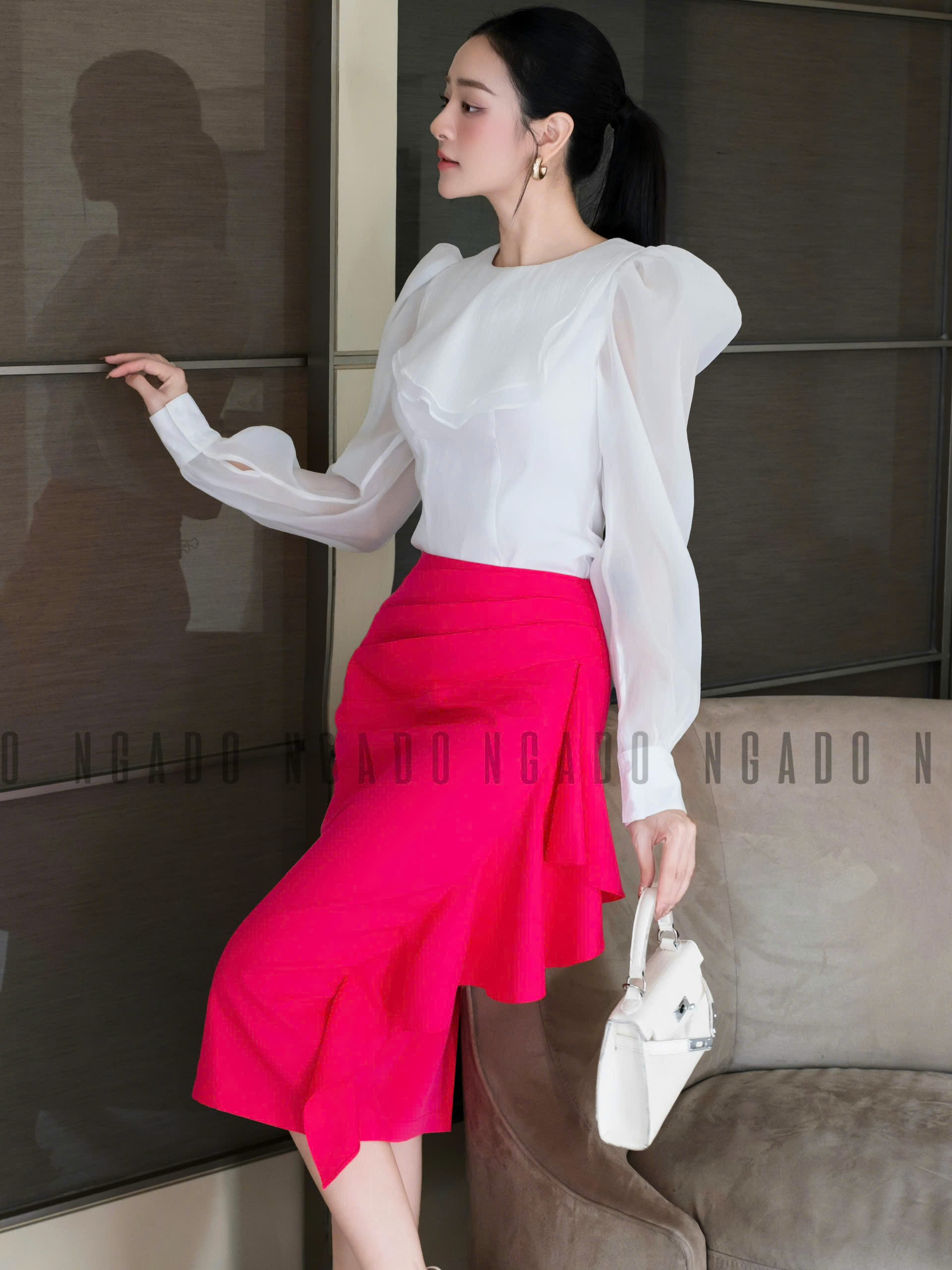CHI TIẾT SẢN PHẨM - Sản phẩm : Chân váy dáng ngắn form chữ A nơ cột trước Slay Miều Est.2013 - Chất liệu : Lụa Mango Gân - Màu sắc : TRẮNG / ĐỎ