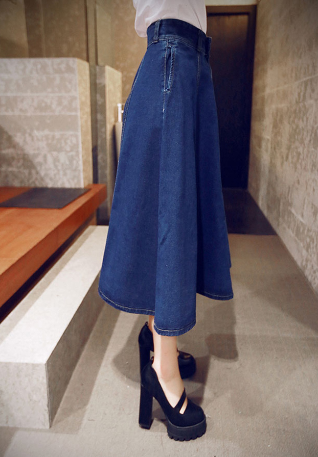Chân váy jeans xanh dáng dài chữ A xẻ tà phía sau