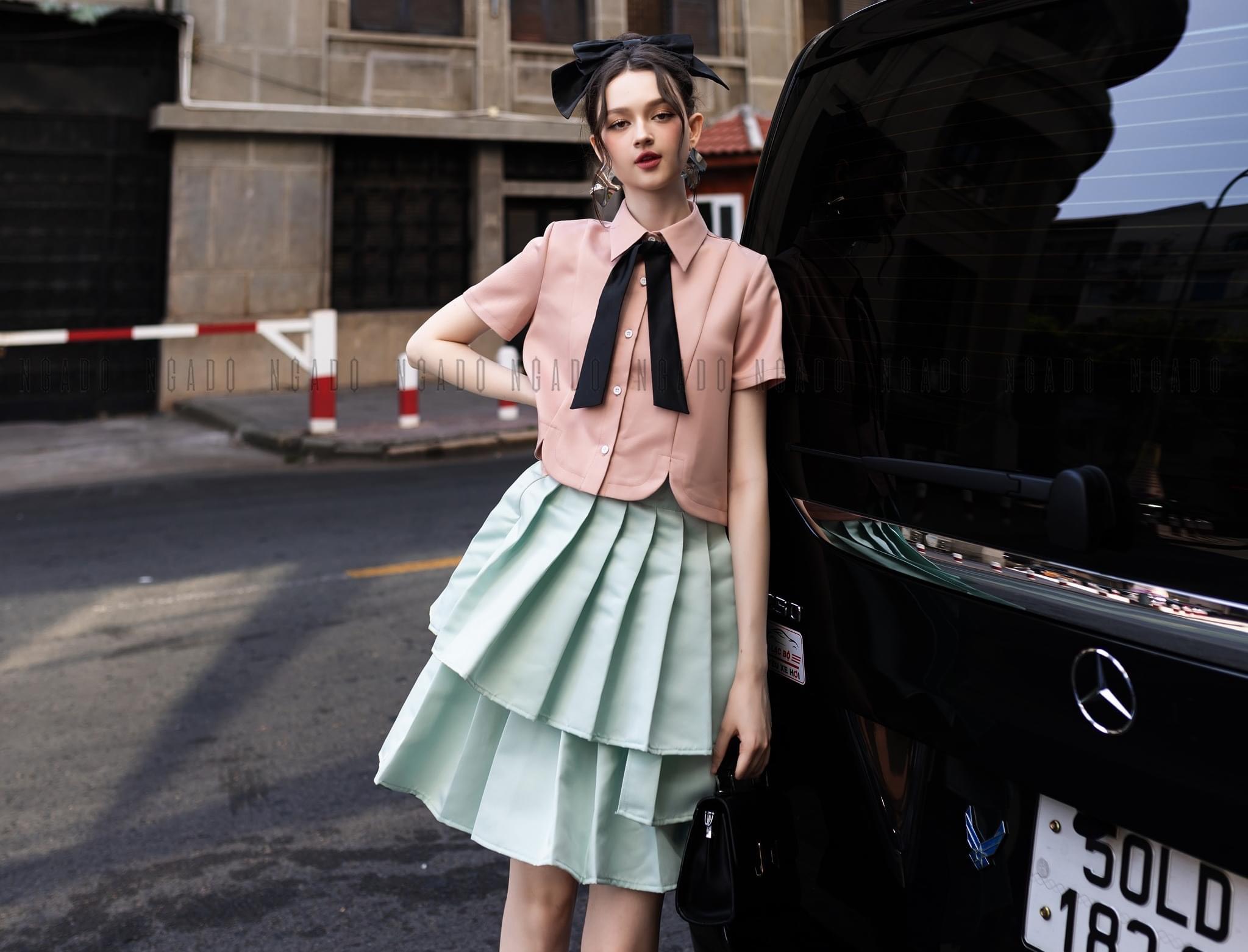 Set áo vest chân váy xếp li siêu hack dáng màu xanh bơ hot của năm (link mua ở bình luận)