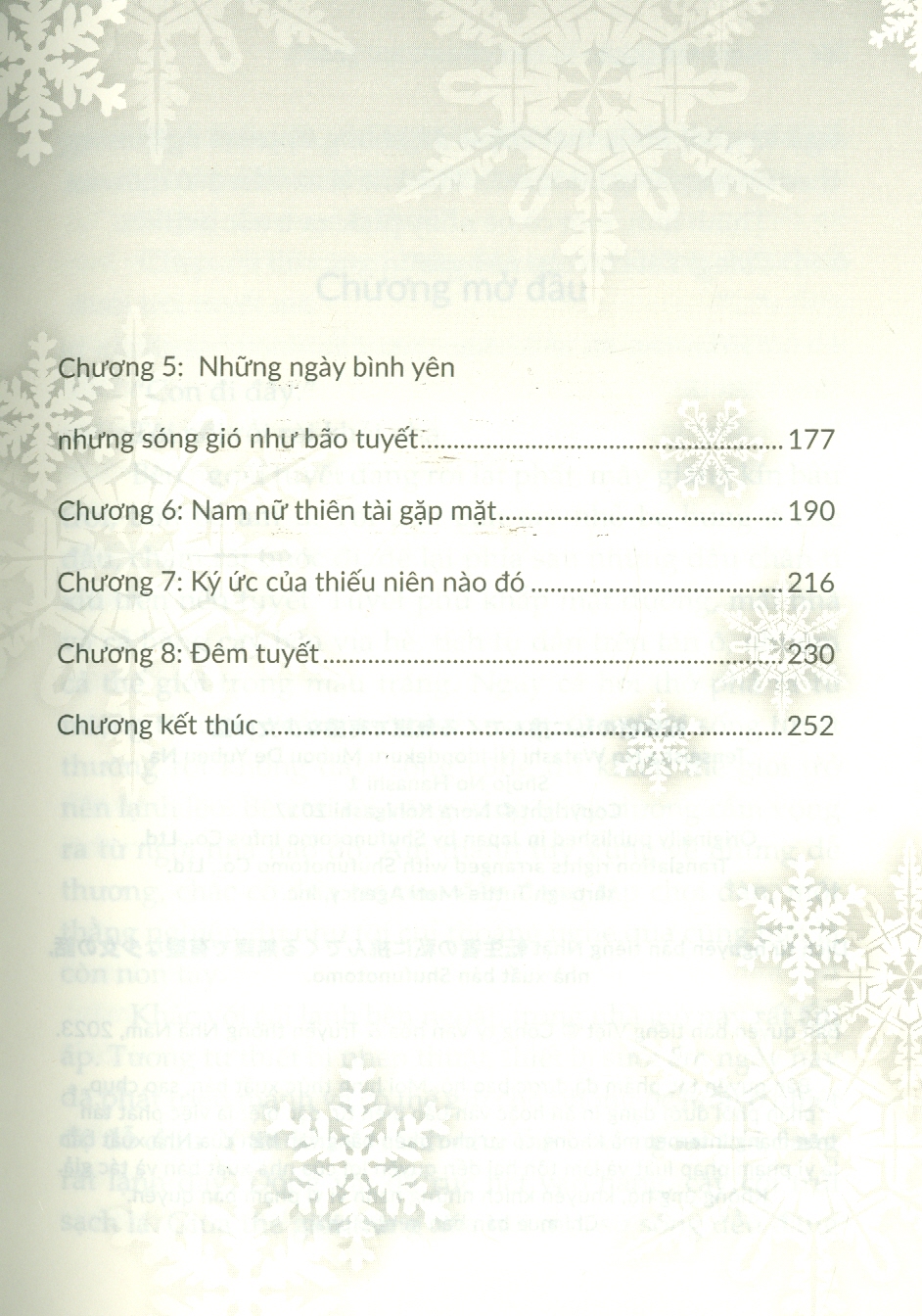 Bên ngoài tuyết đang rơi lất phất, mây giăng kín bầu trời, bốn bề âm u. Tôi đưa bàn tay nhỏ bé bung ô che đầu, chậm rãi bước đi, để lại phía sau những dấu chân tí xíu trên nền tuyết. Tuyết phủ khắp mặt đường, mái nhà và cả hàng cây bên vỉa hè, tích tụ dần trên tán ô, nhuộm cả thế giới trong màu trắng. Ngay cả hơi thở phả ra từ miệng tôi cũng trắng mờ như sương. Ở nơi tôi sống tuyết thường rơi không dày, song cũng đủ khiến thế giới trở nên lạnh lẽo. Bên tai tôi văng vẳng tiếng dương cầm vọng ra từ ngôi nhà nào đó. Âm thanh tuy vụng về nhưng dễ thương, chắc có đứa trẻ nào đấy đang tập chơi đàn, một thằng nghiệp dư như tôi chỉ thoáng nghe qua cũng biết là còn non tay.