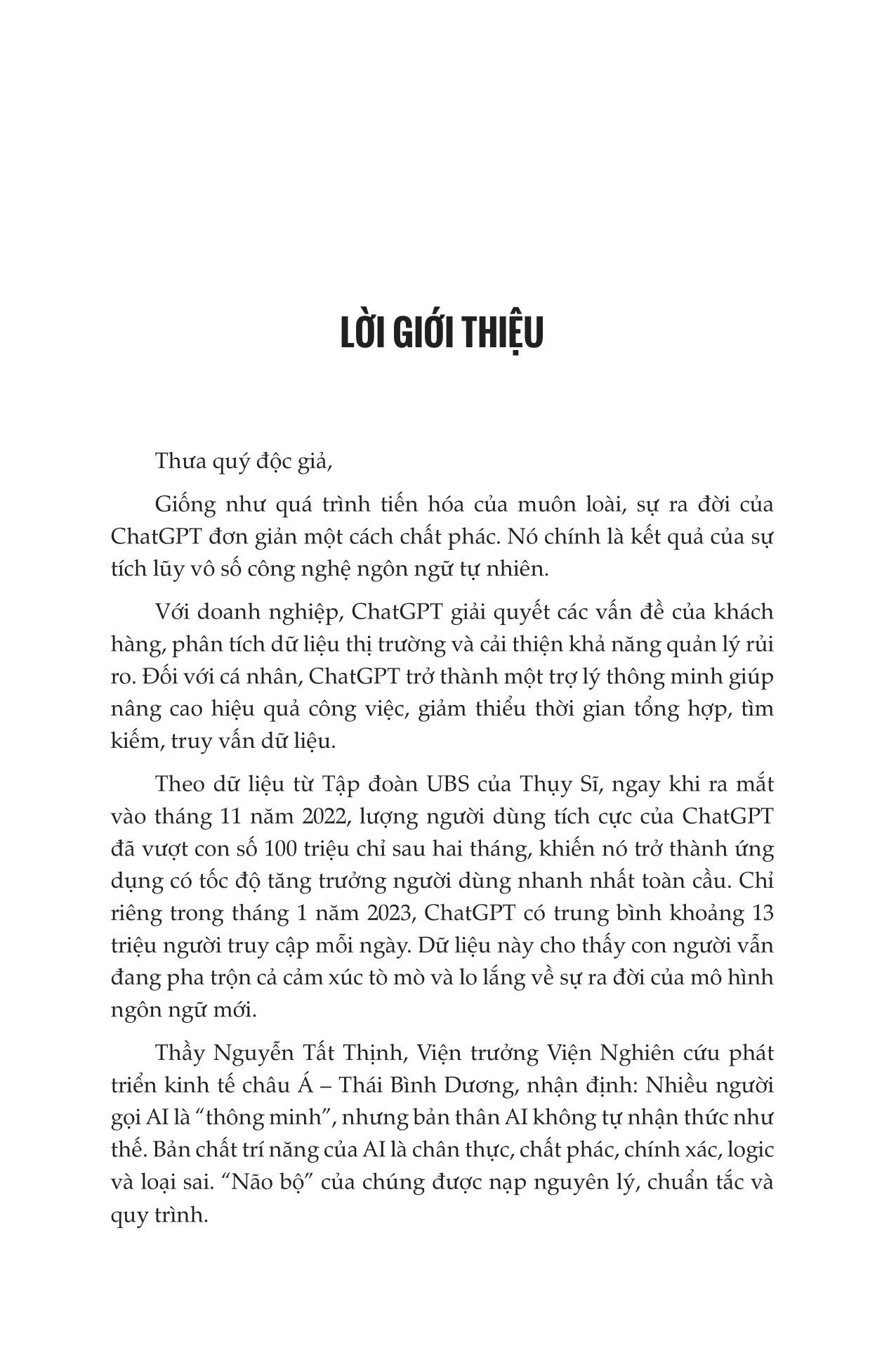 Với sự trợ giúp của Chat GPT, bạn có thể tạo ra những ý tưởng mới và đột phá, phân tích dữ liệu và tạo ra những nội dung cá nhân hóa đầy thu hút. Tương lai của việc sáng tạo nội dung chính là đây, và bây giờ là lúc ta khai thác sức mạnh của AI để luôn dẫn đầu với tư cách là một nhà lãnh đạo tư tưởng. Giống như sự tiến hoá của các loài sinh vật, sự ra đời của Chat GPT rất đơn giản, cũng là thành quả tích lũy từ vô số các công nghệ ngôn ngữ tự nhiên, thậm chí áp dụng khung Transformer mà Google muốn từ bỏ. Điều hiếm hoi, đây là cuốn sách được tạo ra nhanh chóng dưới sự hỗ trợ của ChatGPT