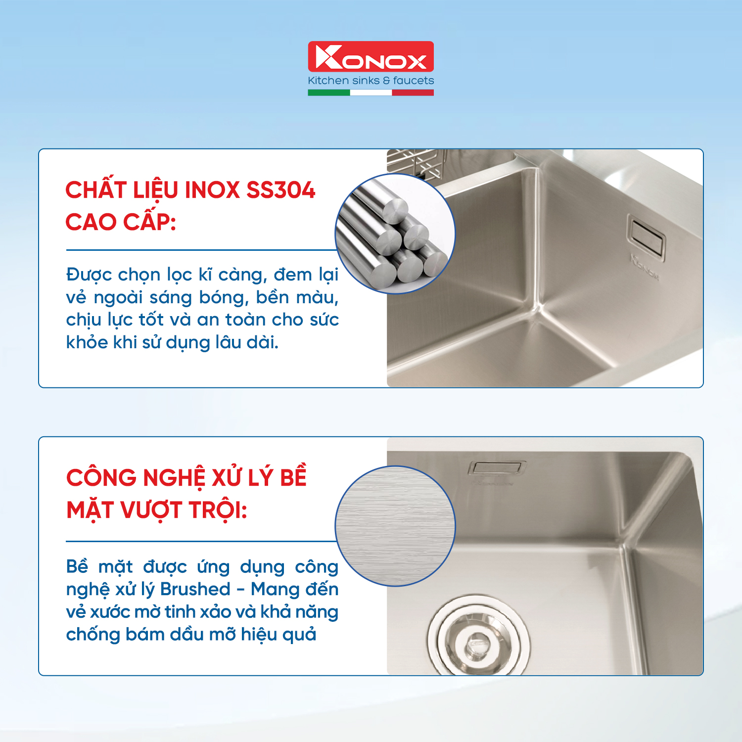 Thành phần chính: được làm từ inox không rỉ, chịu được nhiều nguồn nước. Sản xuất công nghệ của Ý với mẫu mã đa dạng, phong phú về chủng loại, kiểu dáng châu âu. Thiết