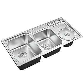 Kích thước hố chậu :Hố bên trái chậu có kích thước : 310x 365x230 mm.Hố bên phải chậu có kích thước : 270 x 310 x 230 mm.Hố rác đường kính 20cm