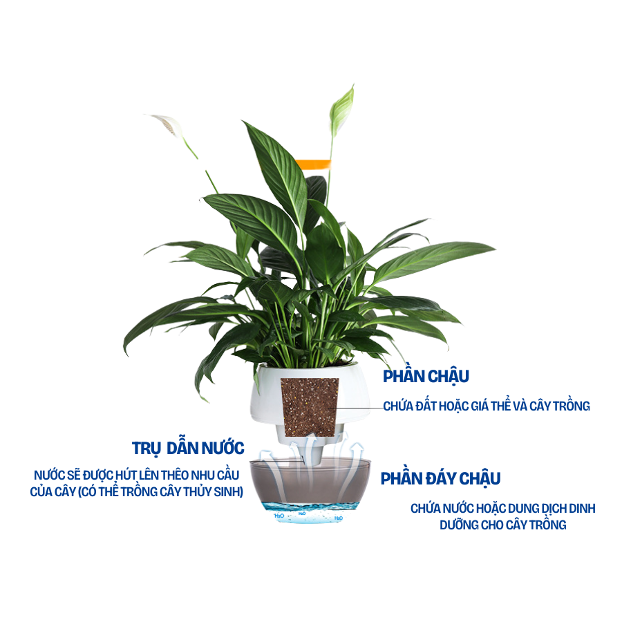 - Thiết kế đáy chậu thoáng khí giúp rễ "thở" Cơ chế hoạt động: Nước sẽ được hút lên theo nhu cầu của cây qua phần trụ nhỏ ở dưới đáy của chậu, tránh hiện tượng nước hút lên nhanh dẫn đến tình trạng đất quá ẩm hay úng rễ. Màu sắc: Màu trắng