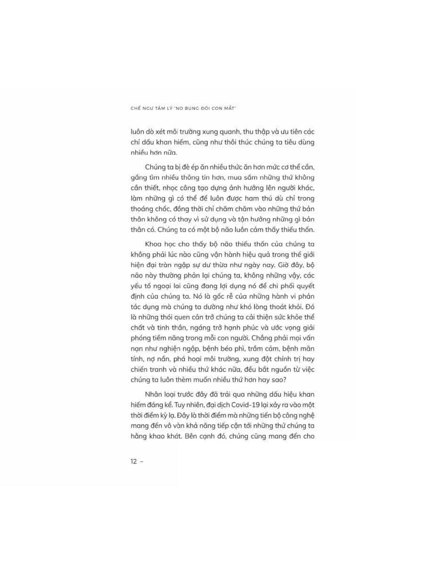 Chế Ngự Tâm Lý “No Bụng Đói Con Mắt” của Michael Easter đưa người đọc vào một hành trình kích thích tư duy để tìm hiểu sự phức tạp của tâm trí con người và lý do đằng sau những ham muốn vô độ của chúng ta. Easter khám phá khái niệm về tư duy khan hiếm, "vòng lặp thiếu thốn" - một chu kỳ liên tục khiến chúng ta mong muốn sở hữu nhiều hơn trong các khía cạnh khác nhau của cuộc sống, từ thực phẩm và của cải vật chất đến thông tin cũng như sức ảnh hưởng.