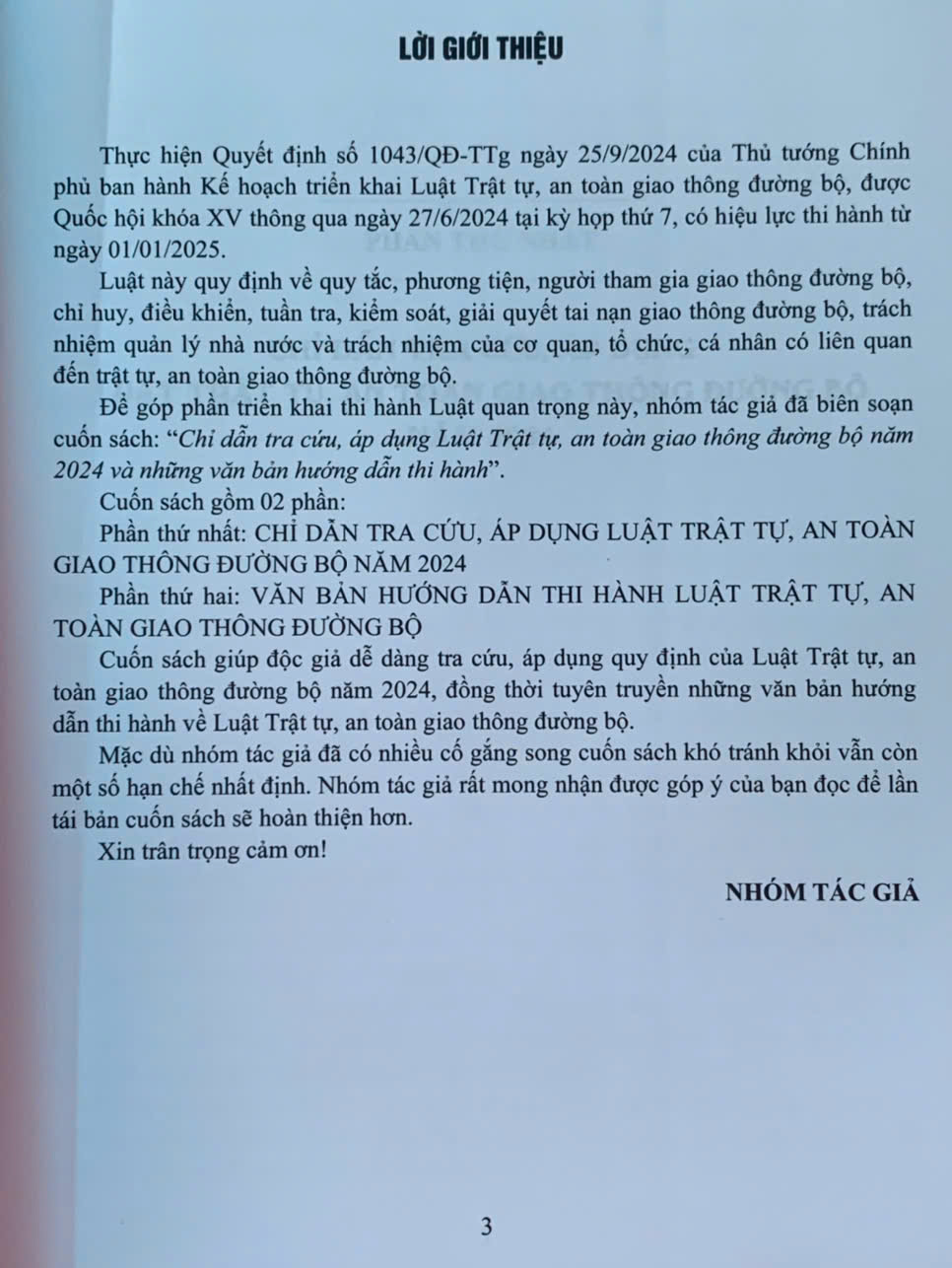 Cuốn sách giúp độc giả dễ dàng tra cứu, áp dụng quy định của Luật Trật tự, an toàn giao thông đường bộ năm 2024, đồng thời tuyên truyền những văn bản hướng dẫn thi hành về Luật Trật tự, an toàn giao thông đường bộ.