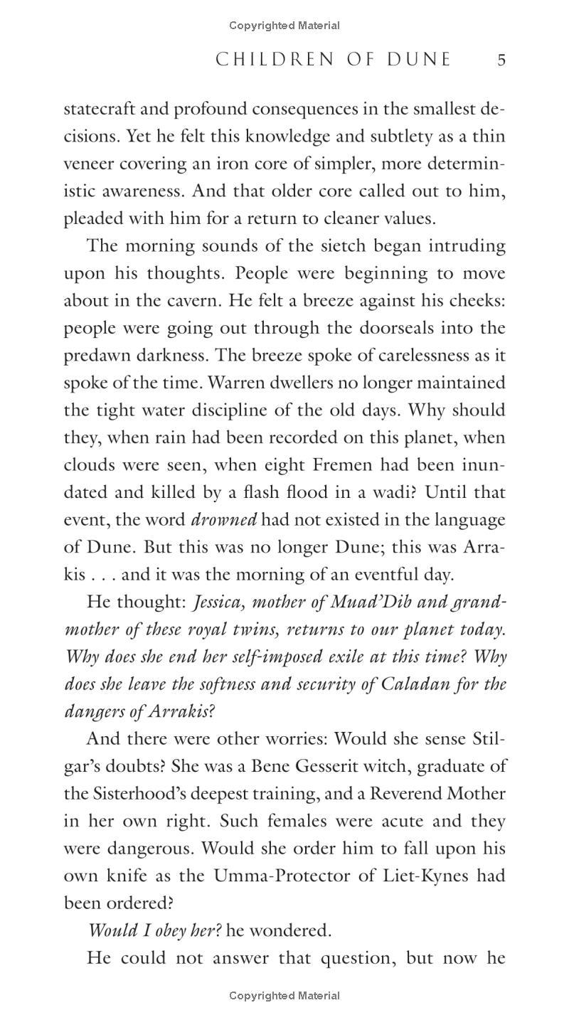 The Children of Dune are twin siblings Leto and Ghanima Atreides, whose father, the Emperor Paul Muad’Dib, disappeared in the desert wastelands of Arrakis nine years ago. Like their father, the twins possess supernormal abilities—making them valuable to their manipulative aunt Alia, who rules the Empire in the name of House Atreides.