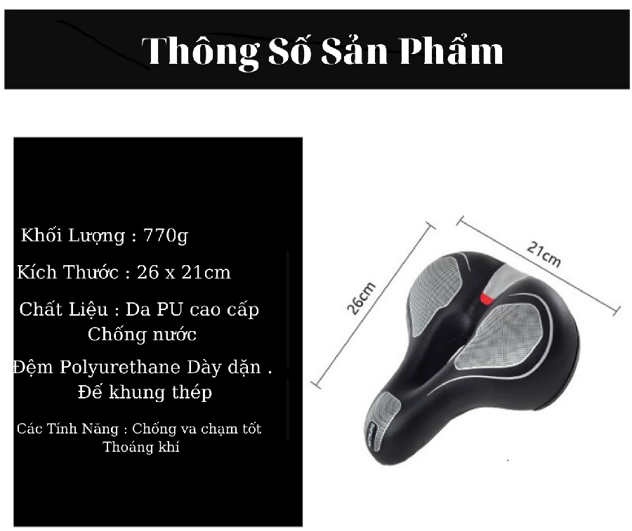 Đệm Yên Xe Đạp Thể Thao Đàn Hồi Mềm Dày Thoáng Khí Cao Cấp Giúp Êm Mông Thoải Mái (Bản Nâng Cấp) Chống Trượt, Siêu Êm Có Lỗ Rãnh Thoát (Thân Rộng) Chất liệu: Mật độ đục lỗ xốp dày hơn sẽ làm cho bạn cảm giác thoải mái hơn và cũng bảo vệ hông tốt hơn. Bền, nhẹ và linh hoạt: xe đạp ghế sử dụng thép chắc chắn xe  Ghế  Sắt là bền đẹp nhưng nhẹ dẻo siêu nhẹ và dẻo. Nó hoạt động tốt để làm giảm bumping áp lực bạn sẽ cảm thấy khi xe đạp đi vào một địa hình gồ ghề. Ứng dụng: Yên xe đạp sẽ tốt cho xe đạp leo núi,  xe đạp tập thể dục , xe đạp thể thao Kích thước: 250x200x90mm Trọng lượng: 715g Màu sắc: Đen đỏ Thoải mái: Thoải mái mềm mại, mềm với lò xo nâng cấp Chất liệu: Da PU, đệm mút Bọt biển đàn hồi cao, đáy PP, lò xo chống sốc, miếng dán phản quang; Miếng dán phản quang giúp đạp xe an toàn ban đêm hơn Bề mặt Da chịu mài mòn cao Thoáng khí hơn với thiết kế khí động học
