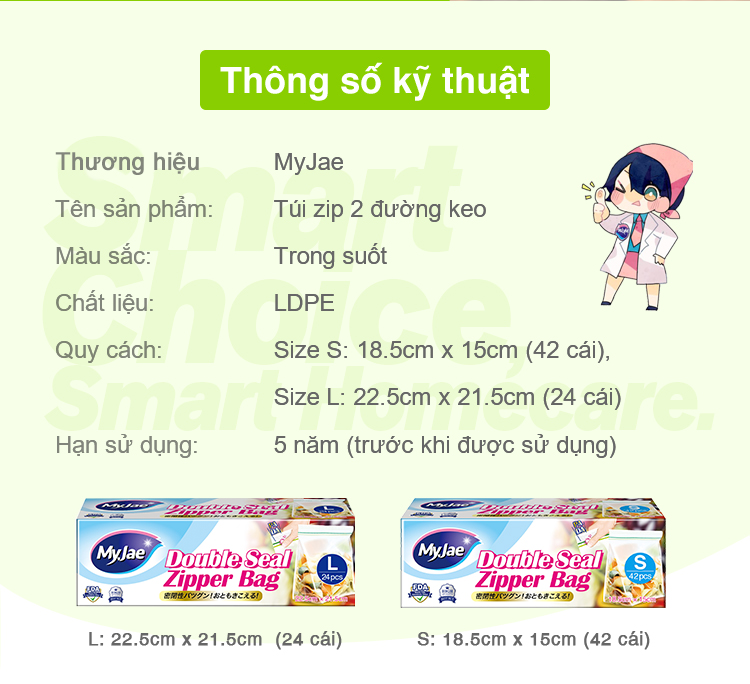 *Thông số kỹ thuật: Thương hiệu : MyJae Tên sản phẩm : Túi zip 2 đường kéo Màu sắc : Trong suốt Chất liệu : PE Kích thước: Size S: 18,5cm *15cm (42 cái) Size