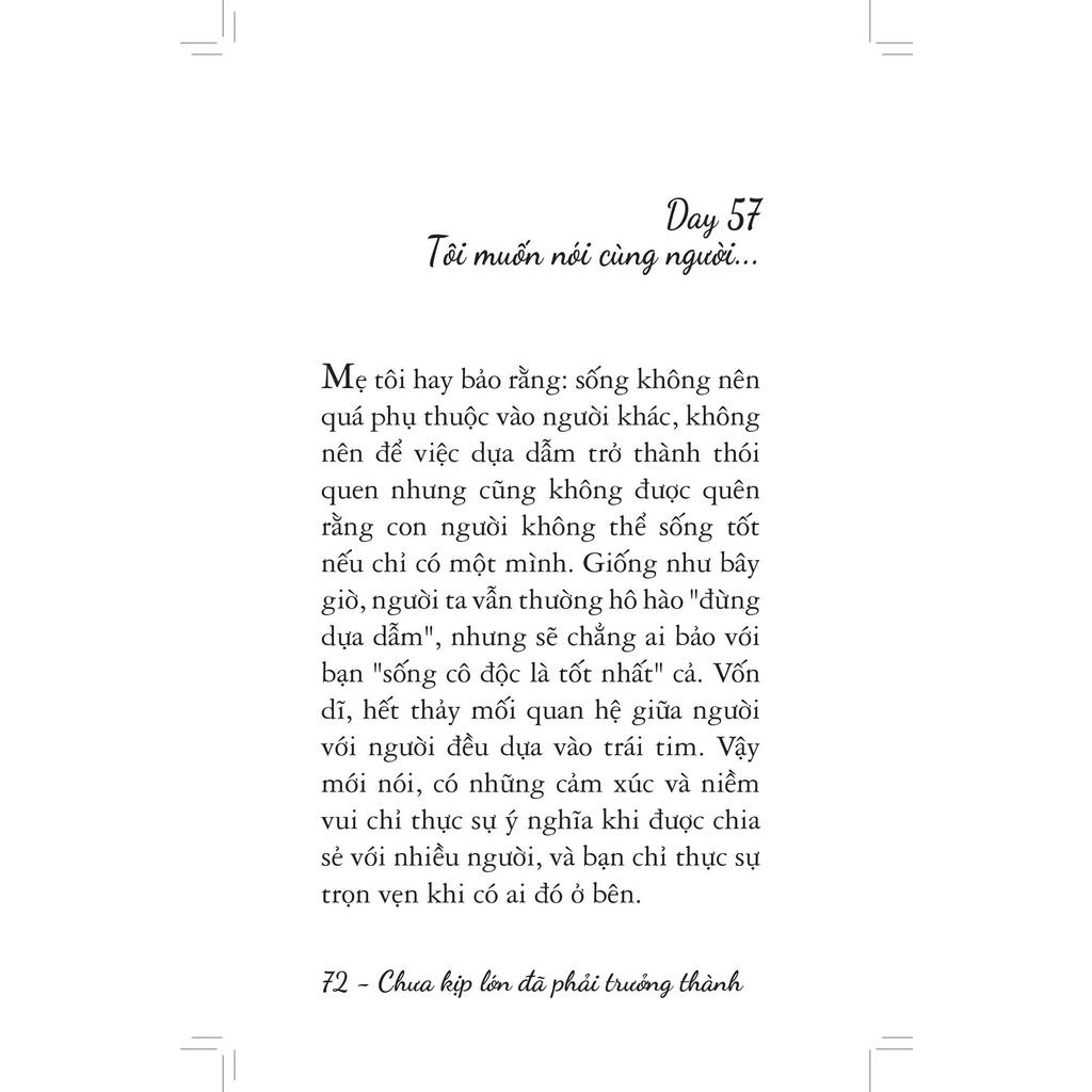 Nếu bạn đang trải qua giai đoạn lạc lõng và cô đơn như vậy, hãy để “Chưa kịp lớn đã phải trưởng thành” làm một người bạn ở bên, xoa dịu tổn thương và gửi tặng bạn đôi điều khích lệ. Mỗi trang sách đều là một lá thư nhắn nhủ bạn về sự đặc biệt của bản thân, về những nỗ lực hoàn thiện không ngừng nghỉ trong thế giới của người trưởng thành.