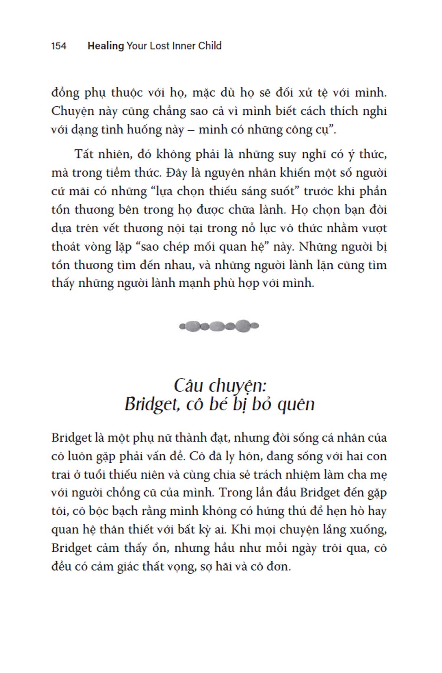 Thông qua các bài tập và câu chuyện của những người đã được chữa lành cũng như của chính tác giả, cuốn sách hướng dẫn làm thế nào để thấu hiểu “đứa trẻ tổn thương” bên trong chính m.ình và cách để kết nối phần nội tâm này với “phần trưởng thành”. Chẳng hạn như nhìn lại dòng sự kiện thời thơ ấu, viết thư trao đổi giữa phần trưởng thành và phần tổn thương, liên hệ những phản ứng bốc đồng trong hiện tại với nguyên nhân trong quá khứ… Việc viết những lá thư chữa lành qua lại với chính m.ình là một cách tuyệt vời để nhanh chóng làm bộc lộ những cảm xúc và kết nối với phần tổn thương bên trong bạn. Bạn đọc cũng sẽ hiểu cách mà “phần người lớn có trách nhiệm” có thể phát triển một bộ công cụ hồi đáp mới, tích cực hơn, thay thế cho những kiểu phản ứng cũ của đứa trẻ tổn thương bên trong.