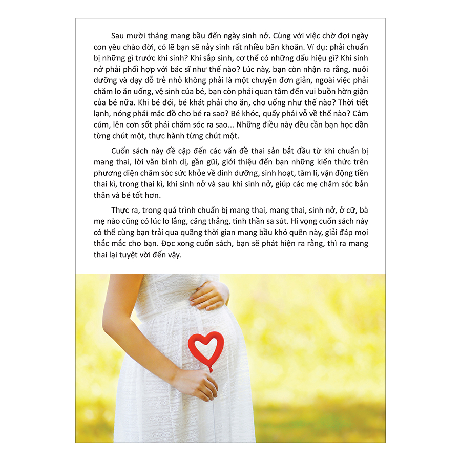 Cuốn sách này đề cập đến các vấn đề thai sản bắt đầu từ khi chuẩn bị mang thai, lời văn bình dị, gần gũi, giới thiệu đến bạn những kiến thức trên phương diện chăm sóc sức khỏe về dinh dưỡng, sinh hoạt, tâm lí, vận động tiền thai kì, trong thai kì, khi sinh nở và sau khi sinh nở, giúp các mẹ chăm sóc bản thân và bé tốt hơn.