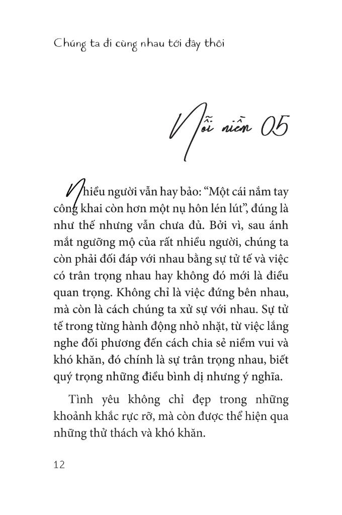 Nếu bạn đang ở trong giai đoạn khó khăn ấy, vậy thì chỉ mong bạn hiểu rằng bạn không cô đơn đâu. Có ai từng yêu mà chưa từng nếm trải đắng cay? Trong cuốn sách “Chúng ta đi cùng nhau tới đây thôi” tác giả Mi Nói đã gói ghém tất cả những kỷ niệm, những nhiệt thành tuổi trẻ, để trải lòng, để đồng cảm với những trái tim đang cần được chữa lành.