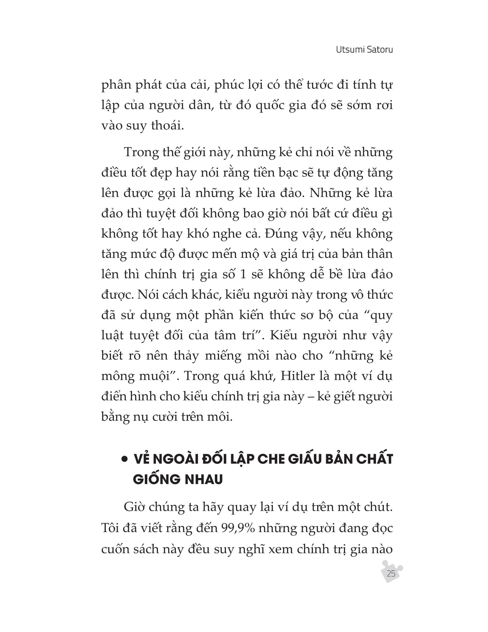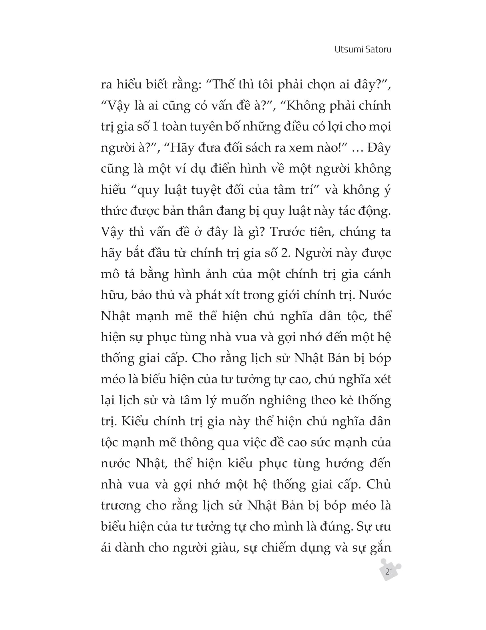 - Phần ứng dụng: từ chương 11 đến chương 18: Bàn về tác động của các quy luật tuyệt đối của tâm trí đến các lĩnh vực gần gũi trong cuộc sống như y học, kinh doanh, làm cha mẹ… từ đó rút ra những nhận định đáng giá về khả năng chuyển hóa tâm thức thông qua các quy luật tuyệt đối của tâm trí. Nội dung cuốn sách bàn về những nguồn cơ gây ra các cảm xúc tiêu cực khác nhau, mong muốn kiểm soát chúng của mỗi chúng ta thông qua hành vi phản ứng, phụ thuộc thậm chí là tâm lý giả làm nạn nhân. Qua đó tác giả sẽ cho chúng ta biết tại sao chúng ta lại có những cảm xúc tiêu cực như thế, và chúng ảnh hưởng như thế nào đến cơ thể, tạo ra bệnh tật và gây bối rối trong đời sống công việc lẫn cá nhân của chúng ta. Ngoài ra, ông cũng truy nguyên những tiêu cực này về các quy luật tuyệt đối của tâm trí, hướng dẫn chúng ta cách đối phó với những sự thật đã tạo ra vấn đề để tìm về một cuộc sống an lạc và hạnh phúc. Điểm mới mẻ trong cuốn sách này là tác giả tiếp cận vấn đề theo hướng quy nạp, đi từ kết quả, phân tích kết quả và tìm ra nguyên nhân. Từ đó, biết cách trang bị cho mình những “biện pháp” phòng bị dựa trên trải nghiệm. Với lối viết ngắn gọn và súc tích, Utsumi Satoru sẽ cung cấp cho độc giả những bí kíp thay đổi thái độ, chuyển hóa tâm thức thực sự hữu ích để có thể sắp xếp cuộc sống một cách tốt nhất.