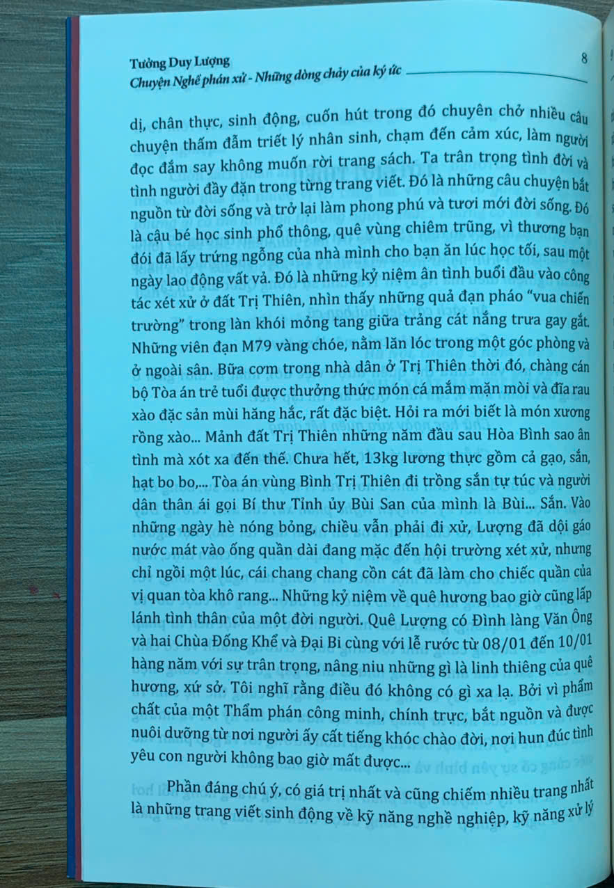 Trong dòng chảy của ký ức, rất nhiều người đã đi qua, xuất hiện trong cuộc đời tác giả. Có thể họ là Thẩm phán, Kiểm sát viên, Luật sư, Chánh án... cũng có thể là chị đầu bếp, anh lái xe... nhưng cũng giống như tác giả, dù có ở vị trí công tác nào thì họ cũng là những con người sống và trưởng thành, có đóng góp nhất định cho sự phát triển của nền tư pháp nước nhà, dường như tác giả muốn đưa tới bạn đọc những gì chân thật và sống động nhất. Khi thể hiện những dòng chảy này, tác giả không có mục đích gì hơn là ghi lại những kỷ niệm, làm tươi mới lại những kỷ niệm của tác giả với từng người bạn, người đồng nghiệp...