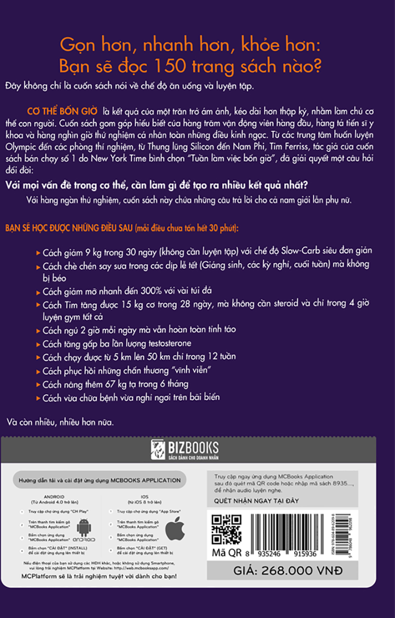 Con người bạn sẽ trở nên hoàn thiện hơn, khỏe mạnh hơn bao giờ hết khi có phương pháp tập luyện, chế độ ăn uống khoa học. Những phương pháp thực nghiệm mà tác giá đưa ra sẽ là bài học tuyệt vời cho bất kỳ ai, đừng bỏ qua cuốn sách “Cơ thể 4 giờ” để có một cơ thể tuyệt nhất nhé.