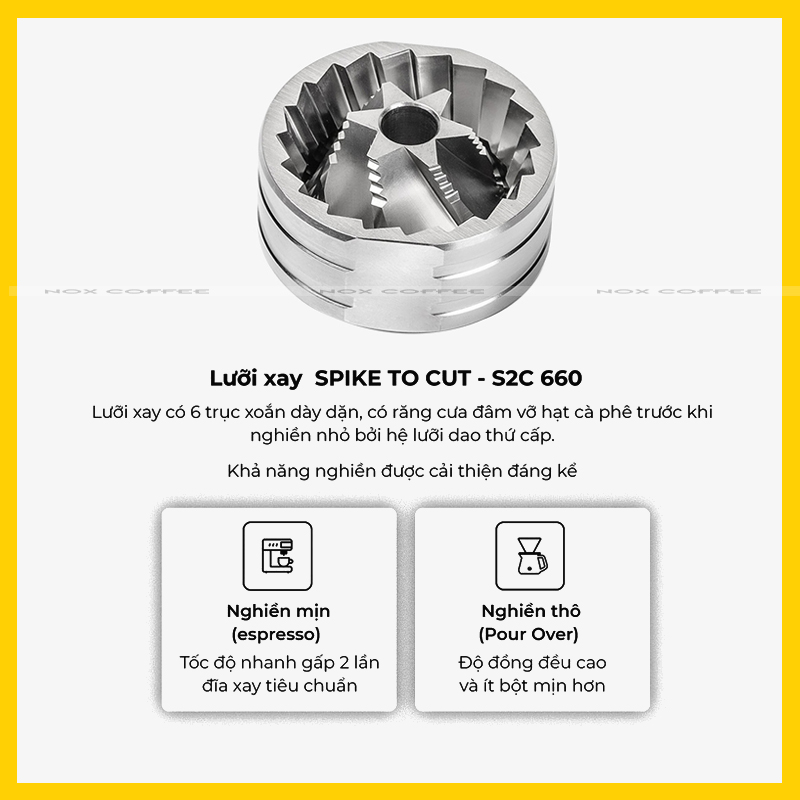 - Lưỡi S2C - 6 cánh chất liệu SUS 420 (2 lần nghiền), thời gian xay nhanh hơn, bột cà phê đều hơn và giảm đáng kể bột mịn.