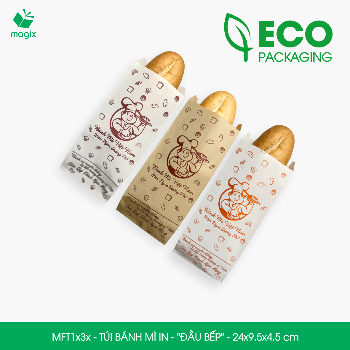 ĐẶC ĐIỂM SẢN PHẨM Chất liệu: Túi bánh mì in thường được làm từ giấy kraft nhật định lượng 50gsm thấm dầu có giấy chứng nhận FDA đảm bảo vệ sinh an toàn thực phầm Thiết kế: Miệng túi thiết kế chia thành 2 lớp dễ dàng thao tác bỏ bánh mì vào túi, đơn giản và tiện dụng    CÔNG DỤNG Tiện lợi: Bảo vệ bánh mì khỏi bụi bẩn, môi trường ô nhiễm, tác động từ bên ngoài và tránh làm dơ tay khi sử dụng Quảng cáo thương hiệu: Túi bánh mì in được sử dụng như một phương tiện quảng cáo nhỏ gọn và hiệu quả, với thiết kế in ấn logo, thông tin về sản phẩm và các thông điệp quảng cáo khác Bảo vệ môi trường: Túi bánh mì được làm từ chất liệu giấy kraft nguyên sinh, giúp giảm thiểu lượng rác thải nhựa và bảo vệ môi trường Tiết kiệm chi phí: Túi giấy bánh mì có giá thành thấp hơn so với các loại bao bì khác như hộp giấy, hộp nhựa đựng bánh mì   TIÊU CHUẨN KỸ THUẬT Chất liệu: Giấy Kraft chuyên dùng cho thực phẩm đạt tiêu chuẩn FDA  Định lượng: 50gsm Mã hàng - Kiểu in - Kích thước  • MFT1N5NN - Túi bánh mì nâu in nâu - "Giỏ bánh mì" - 24x9.5x4.5 cm  • MFT1T5N - Túi bánh mì trắng in nâu - "Giỏ bánh mì" - 24x9.5x4.5 cm  • MFT1N4X - Túi bánh mì nâu in xanh lá - "Best street food" - 24x9.5x4.5 cm  • MFT1T4X - Túi bánh mì trắng in xanh lá - "Best street food" - 24x9.5x4.5 cm  • MFT1N4NN - Túi bánh mì nâu in nâu đỏ - "Best street food" - 24x9.5x4.5 cm  • MFT1T4N - Túi bánh mì trắng in nâu - "Best street food" - 24x9.5x4.5 cm  • MFT1T3C - Túi bánh mì trắng in cam - "Đầu bếp" - 24x9.5x4.5 cm  • MFT1N3NN - Túi bánh mì nâu in nâu đỏ - "Đầu bếp" - 24x9.5x4.5 cm  • MFT1T3NN - Túi bánh mì trắng in nâu đỏ - "Đầu bếp" - 24x9.5x4.5 cm  • MFT1N2NN - Túi bánh mì nâu in nâu đỏ - "Cối xay gió" - 24x9.5x4.5 cm  • MFT1T2N - Túi bánh mì trắng in nâu - "Cối xay gió" - 24x9.5x4.5 cm  • MFT1N1NN - Túi bánh mì nâu in nâu đỏ - "Xe bánh mì" - 24x9.5x4.5 cm  • MFT1T1N - Túi bánh mì trắng in nâu - "Xe bánh mì" - 24x9.5x4.5 cm   LƯU Ý Bảo quản sản phẩm nơi khô ráo, sạch sẽ tránh tiếp xúc trực tiếp với ánh nắng mặt trời và nhiệt độ cao.