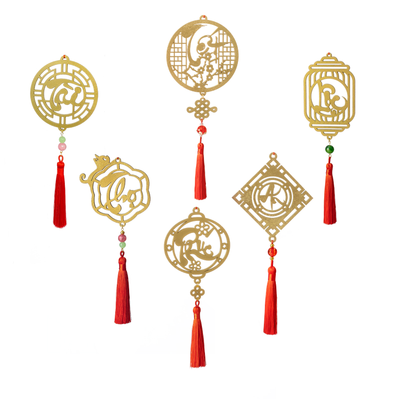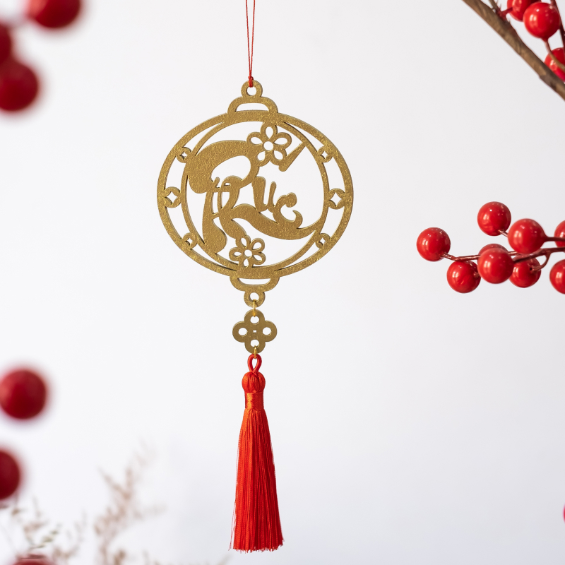 Bộ 11 phụ kiện trang trí Tết thư pháp và hoa văn trong Khai Lộc Hoàng Kim với thiết kế mới lạ và đẹp mắt. ☆ Thích hợp để trang trí Tết cho phòng khách
