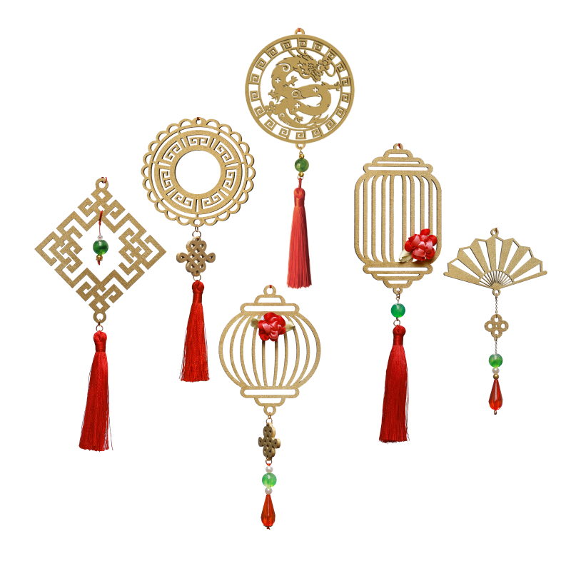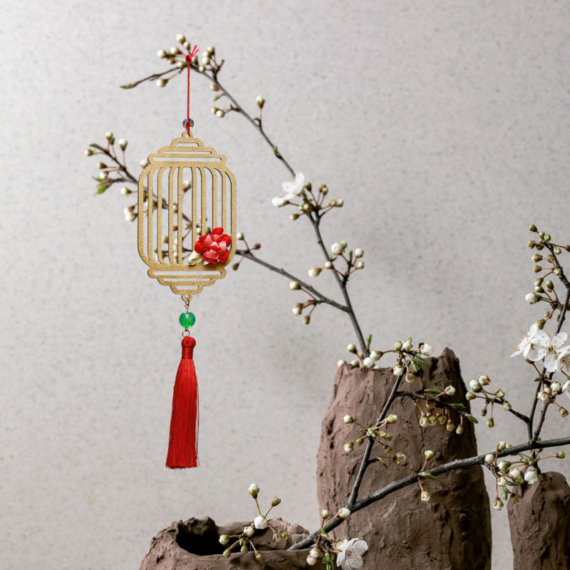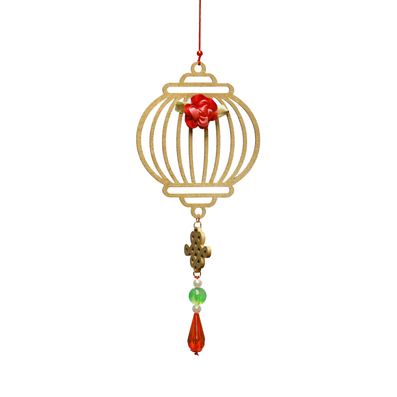 Bộ 05 phụ kiện dây treo Nguyệt hoa đăng đỏ, nổi bật với chất liệu gỗ khắc CNC, điểm xuyến bởi các hạt đỏ. Dây treo được làm thủ công sắc sảo. Là điểm nhấn